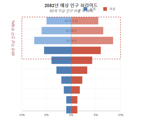 2082년에는 65세 이상 노인 인구 비율이 약 58%에 이를 것으로 예측되어, 고령화로 인한 사회적 부담이 급격히 증가할 전망입니다.