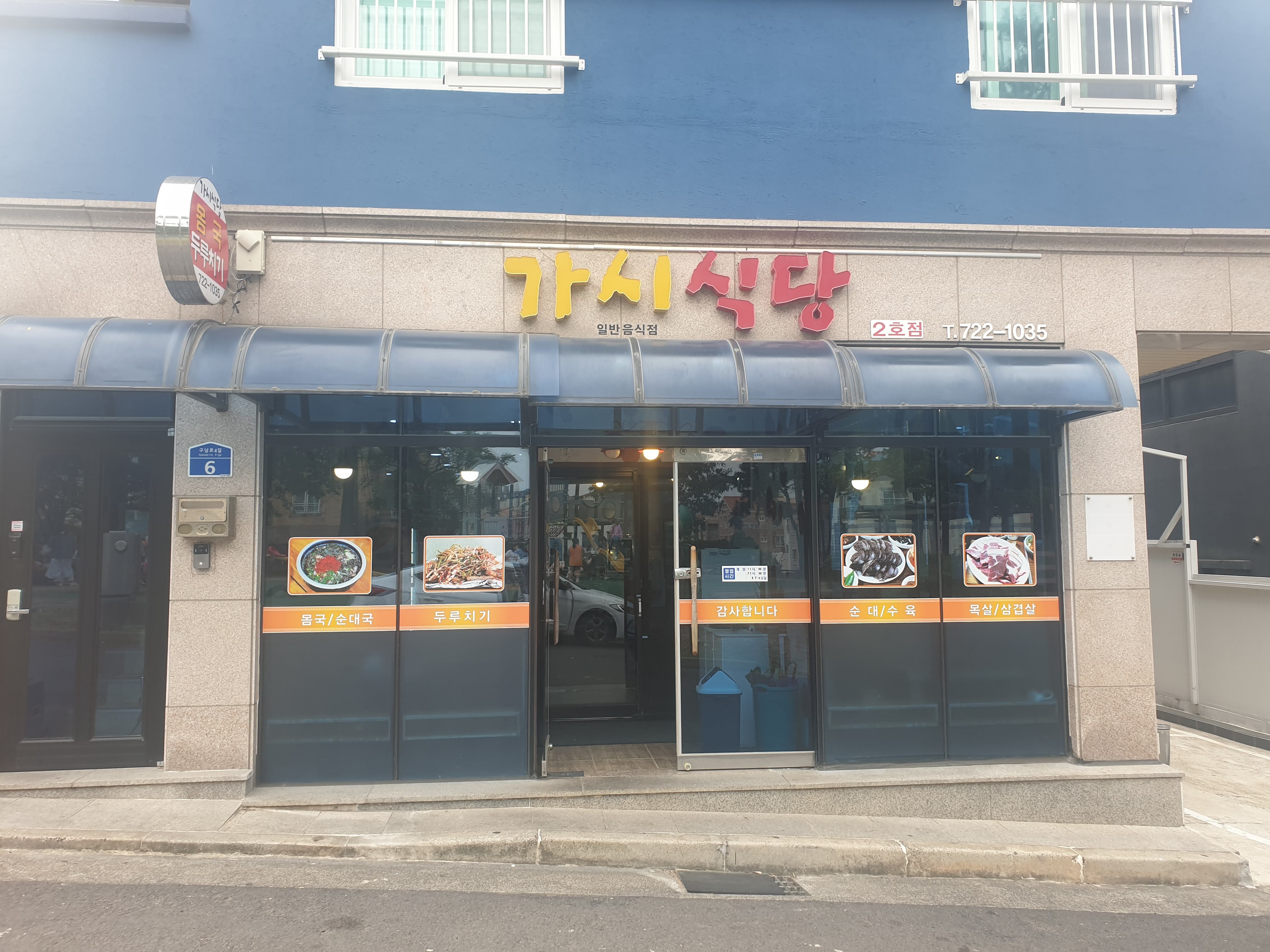 외관은 제주 바다색을 닮은 파란 간판, 실내는 입식·좌식 혼합형 구조로 구성되어 있어요.