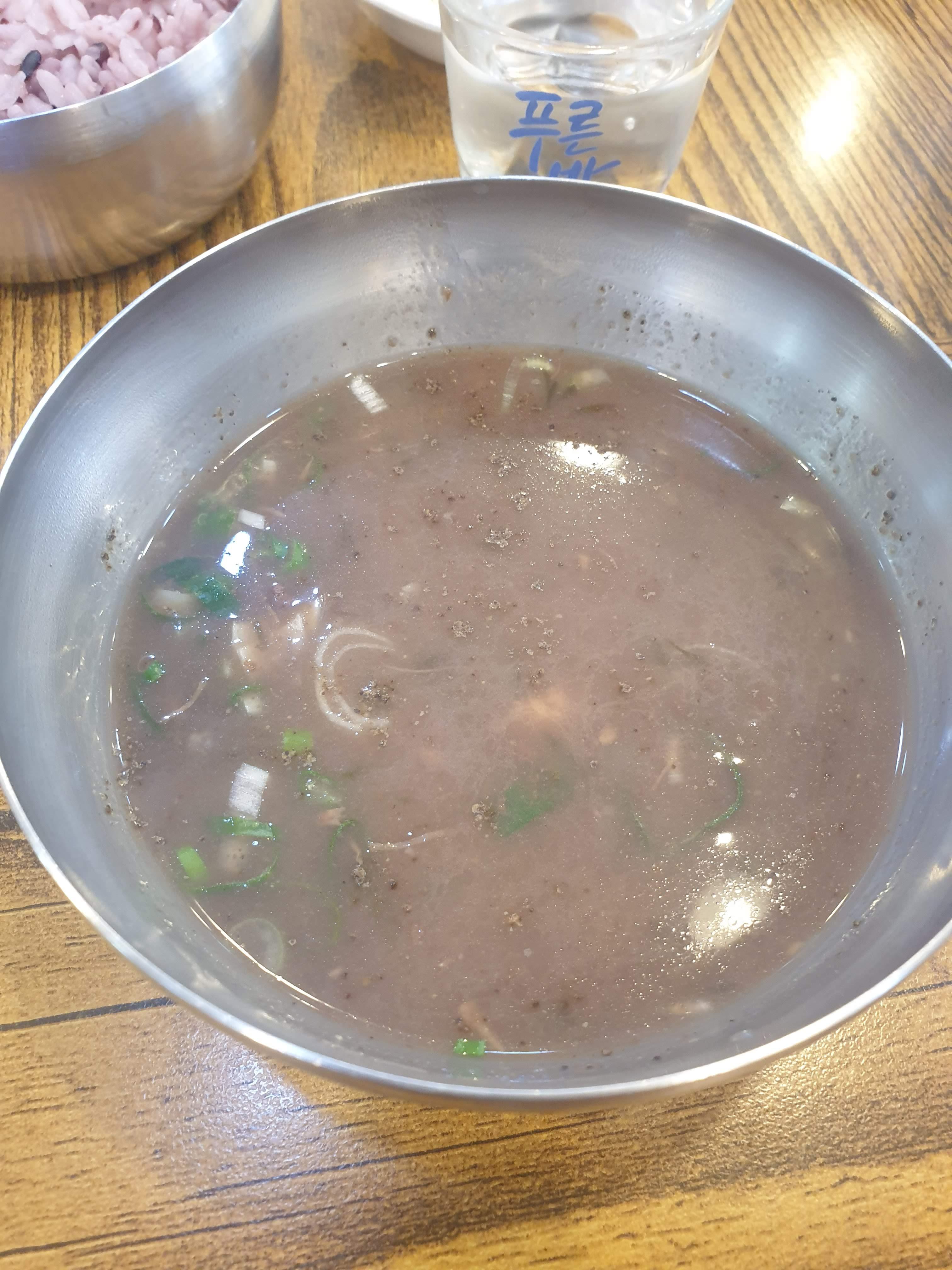 모자반, 돼지 내장, 메밀가루가 들어간 깊은 국물은 마치 죽처럼 걸쭉해요.