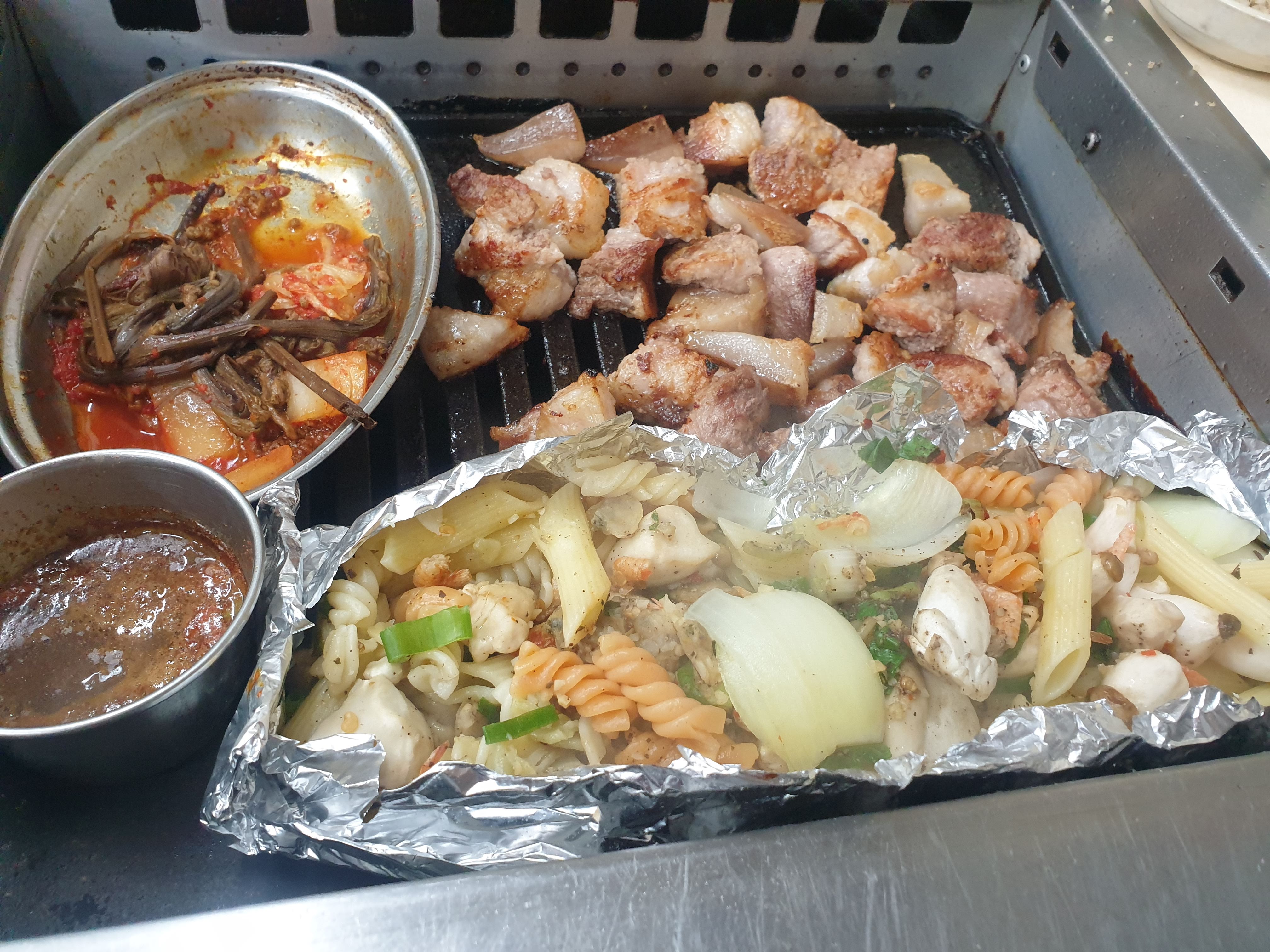 불판 한켠, 은박지 안에서 지글지글 끓는 건 고기와 어울리지 않을 듯한 파스타.