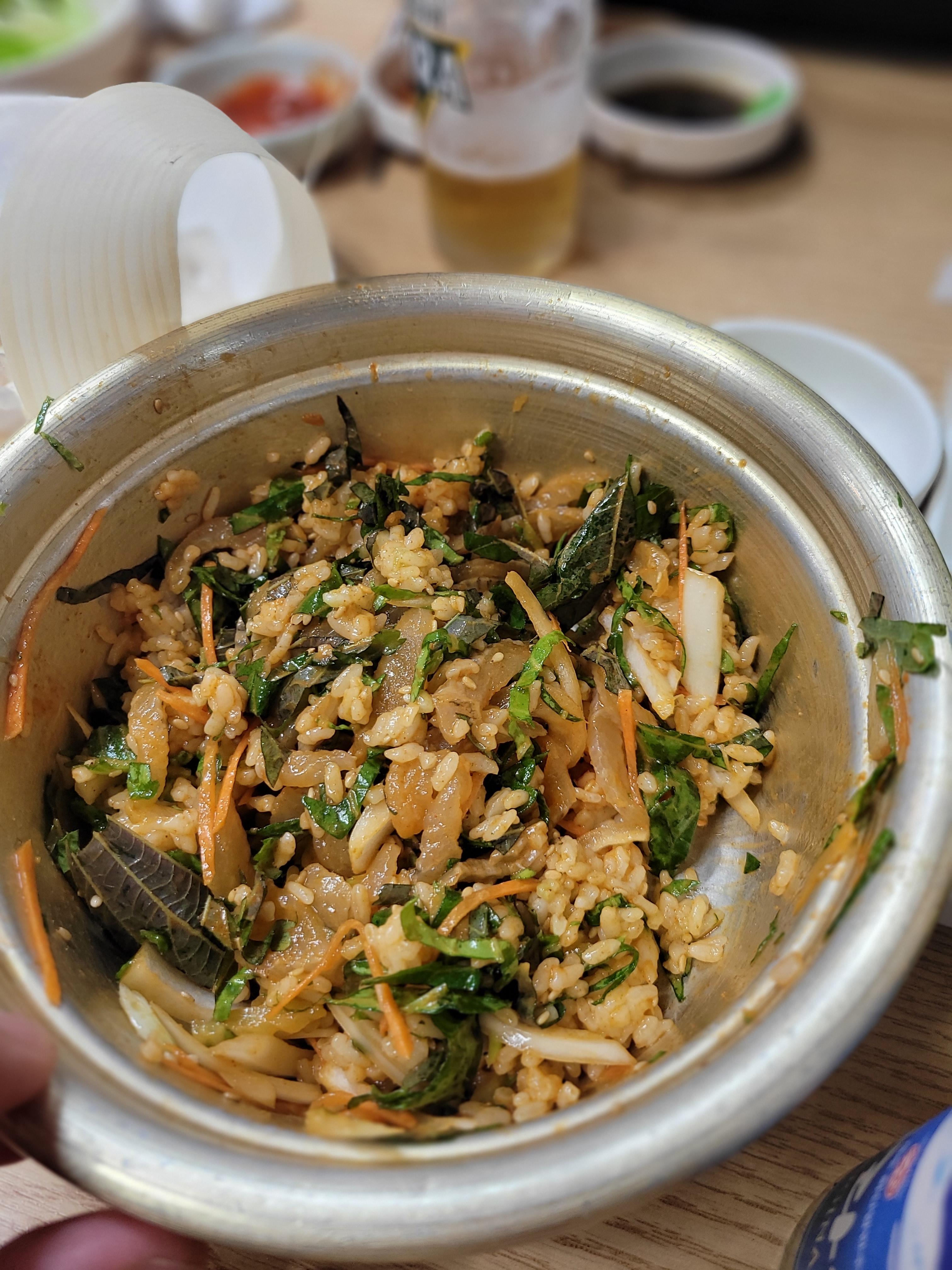 따끈한 밥, 고소한 참기름, 향긋한 채소랑 초장까지 싹 넣고