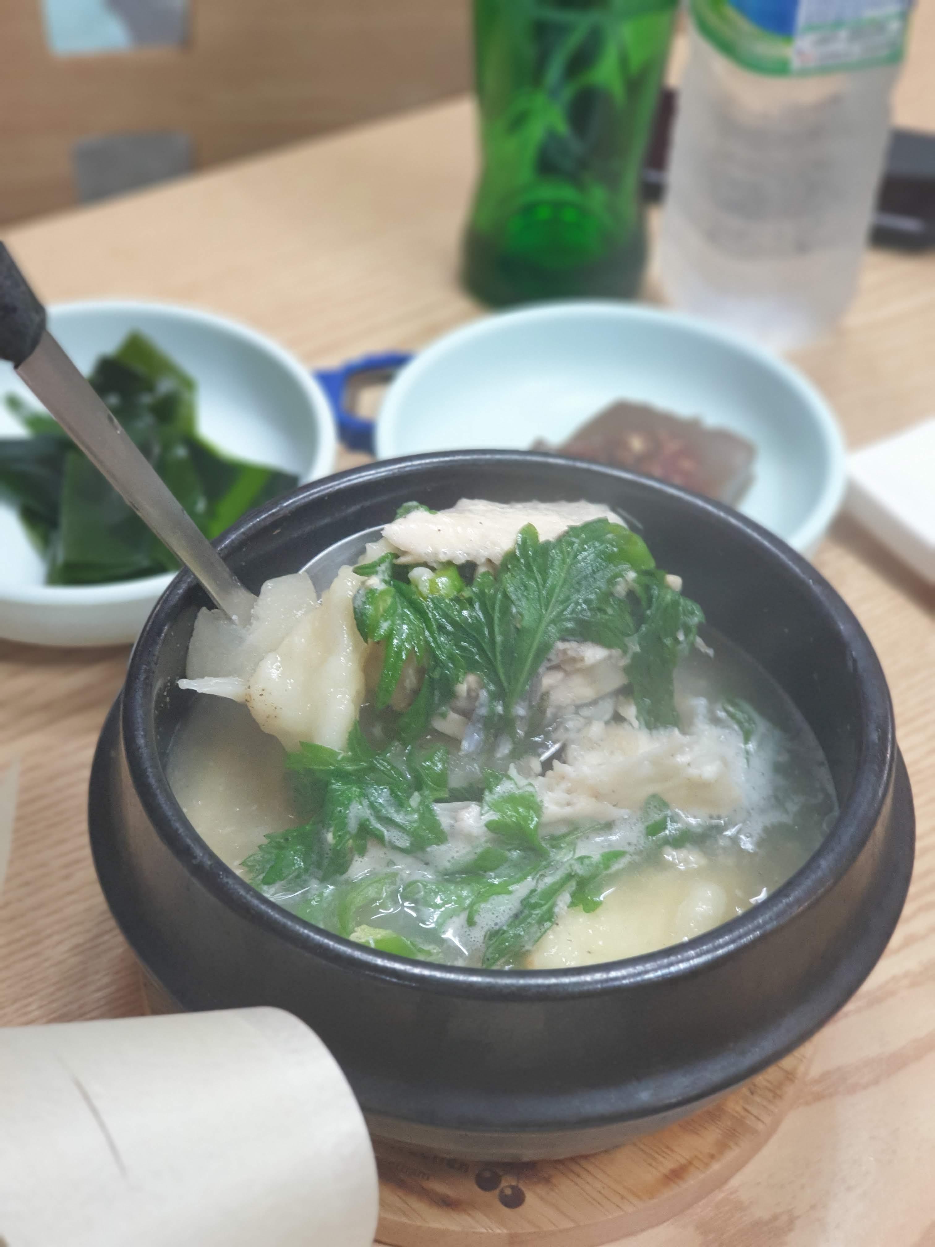 뽀얀 육수에 수제비 들어가고 쑥 향 솔솔 올라오는데,