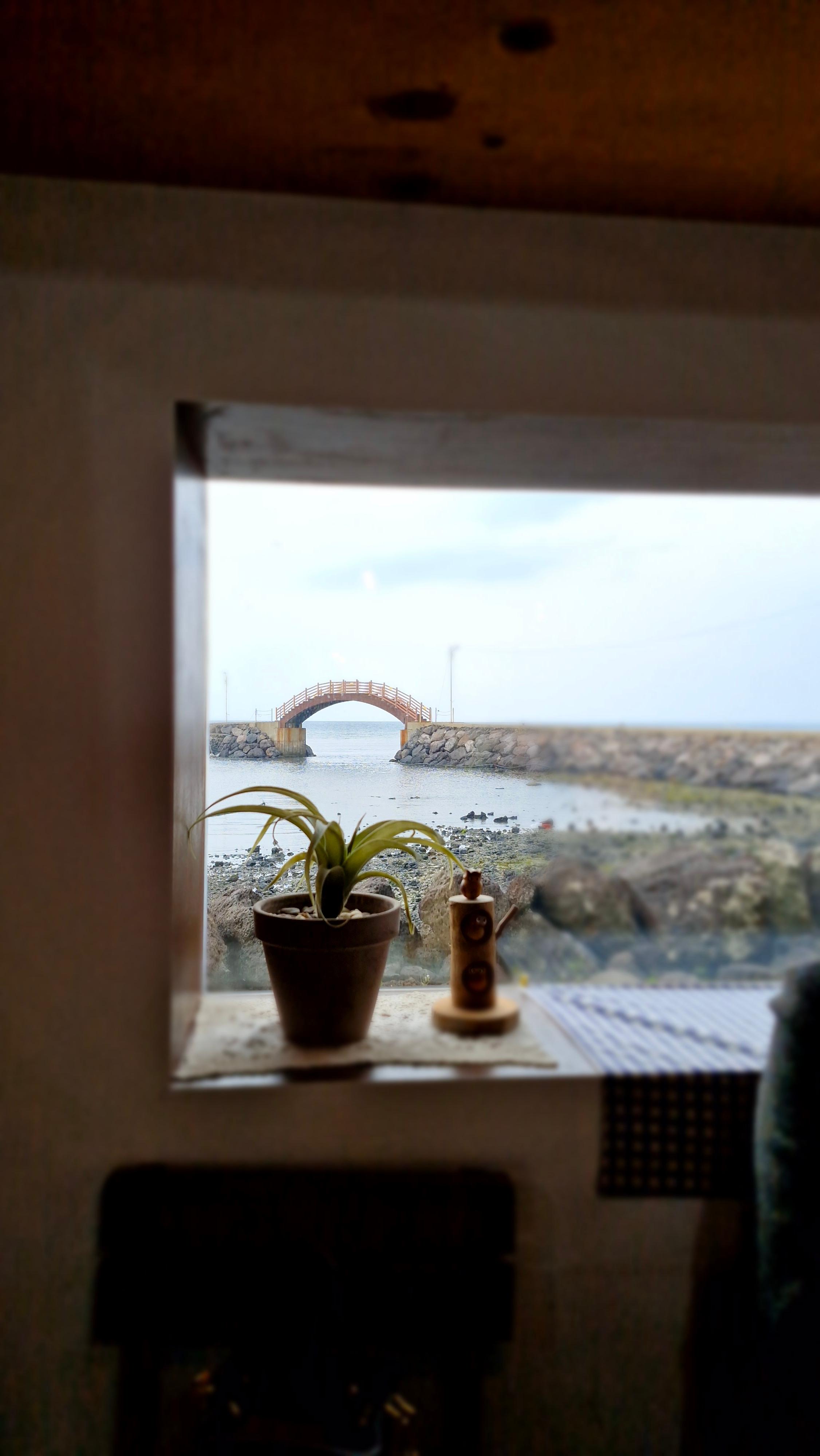 창문 프레임 너머로 펼쳐지는 신촌포구의 바다 풍경입니다.