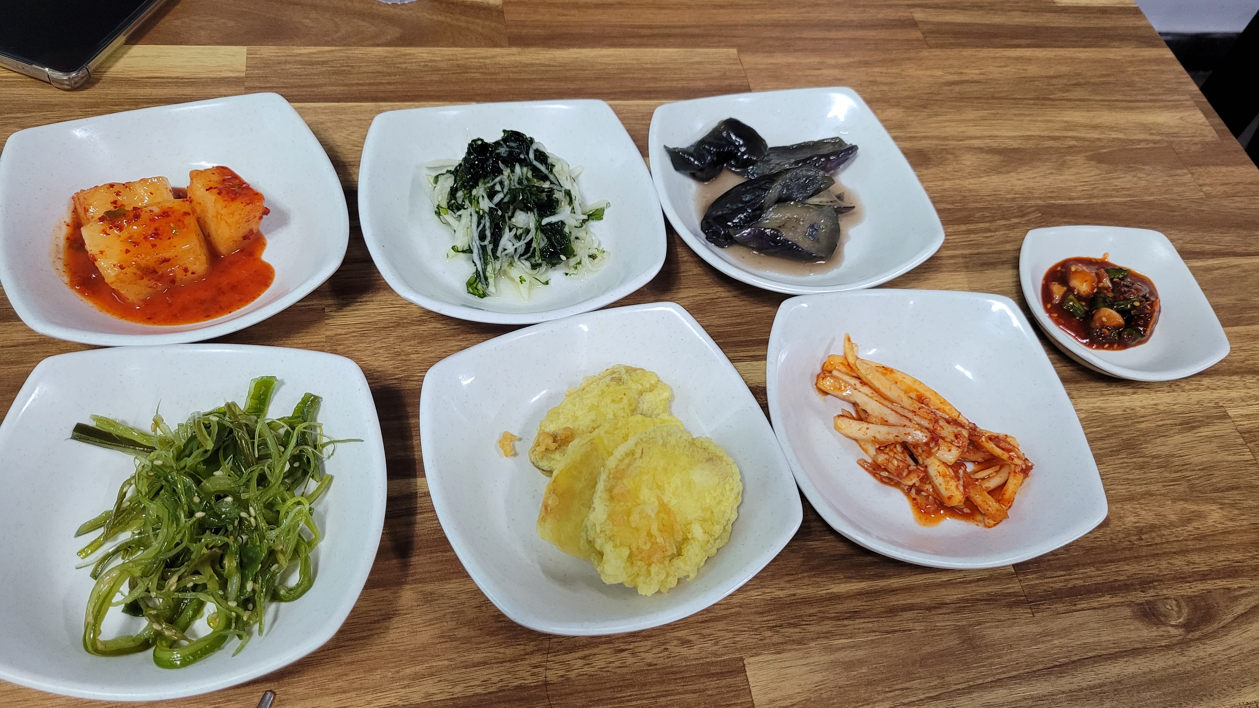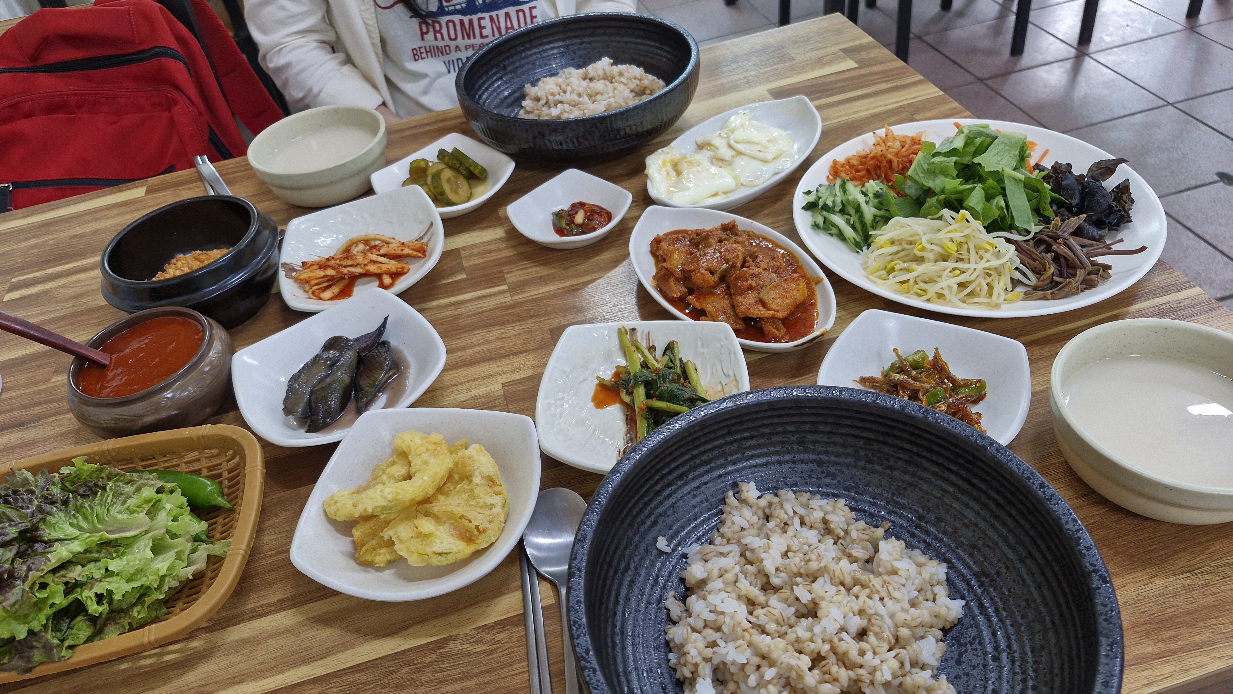문을 열고 들어서니, 따뜻한 된장국 냄새와 함께 조용히 들리는 식기 부딪히는 소리.