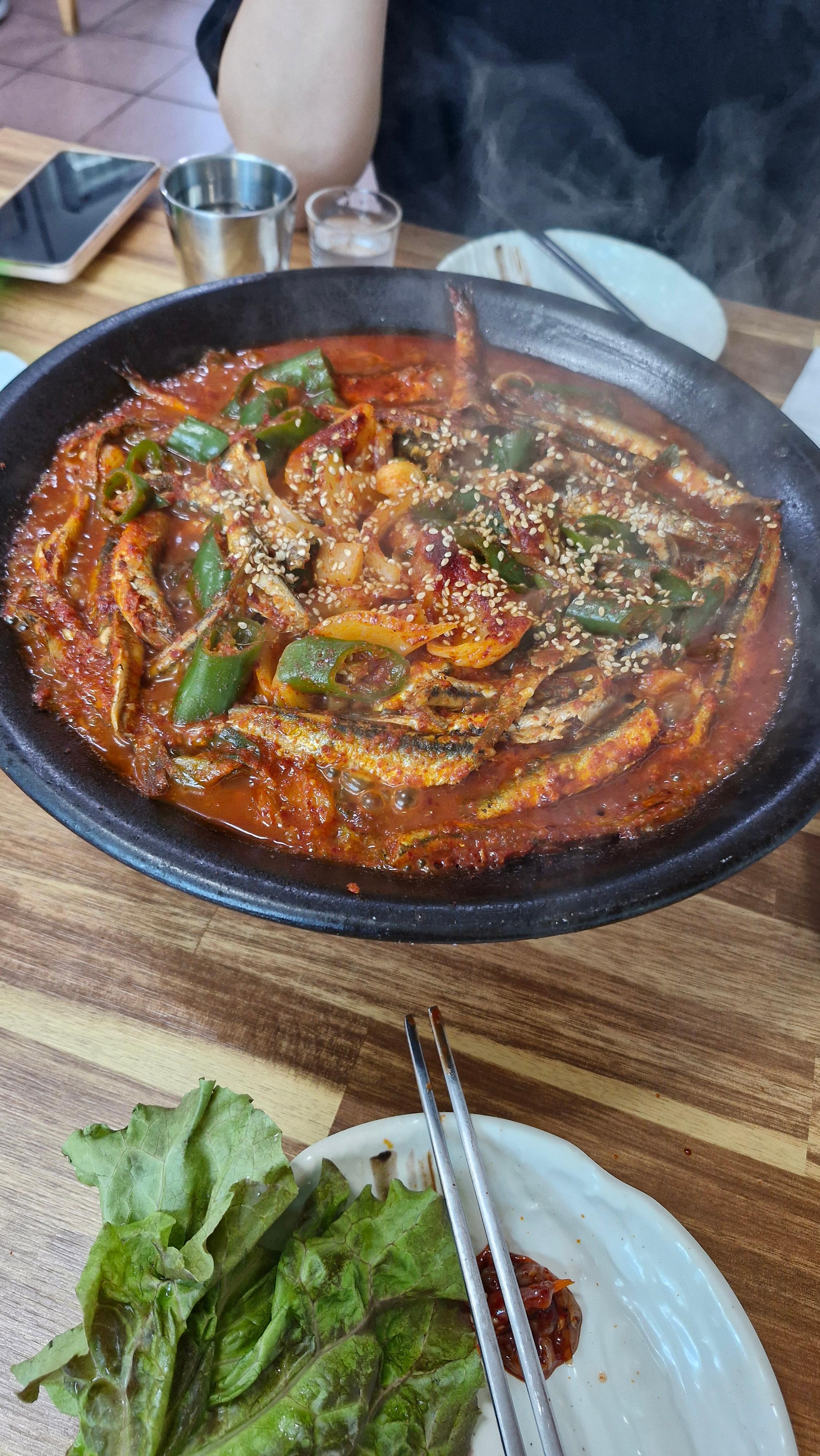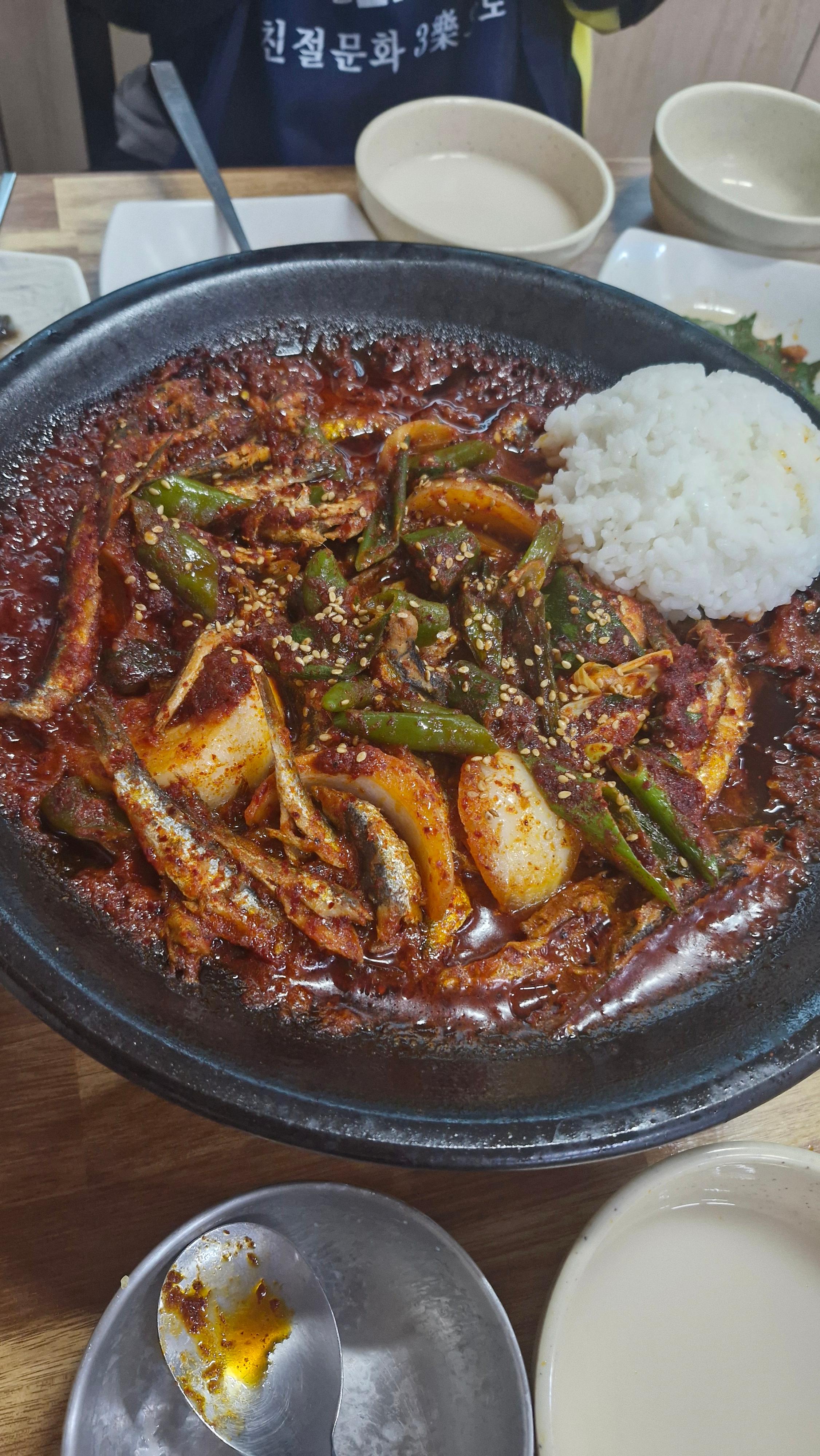 은빛 비늘이 살아 있는 싱싱한 멜살이, 매콤하고 진한 양념 속에 푹 익어 있었습니다.