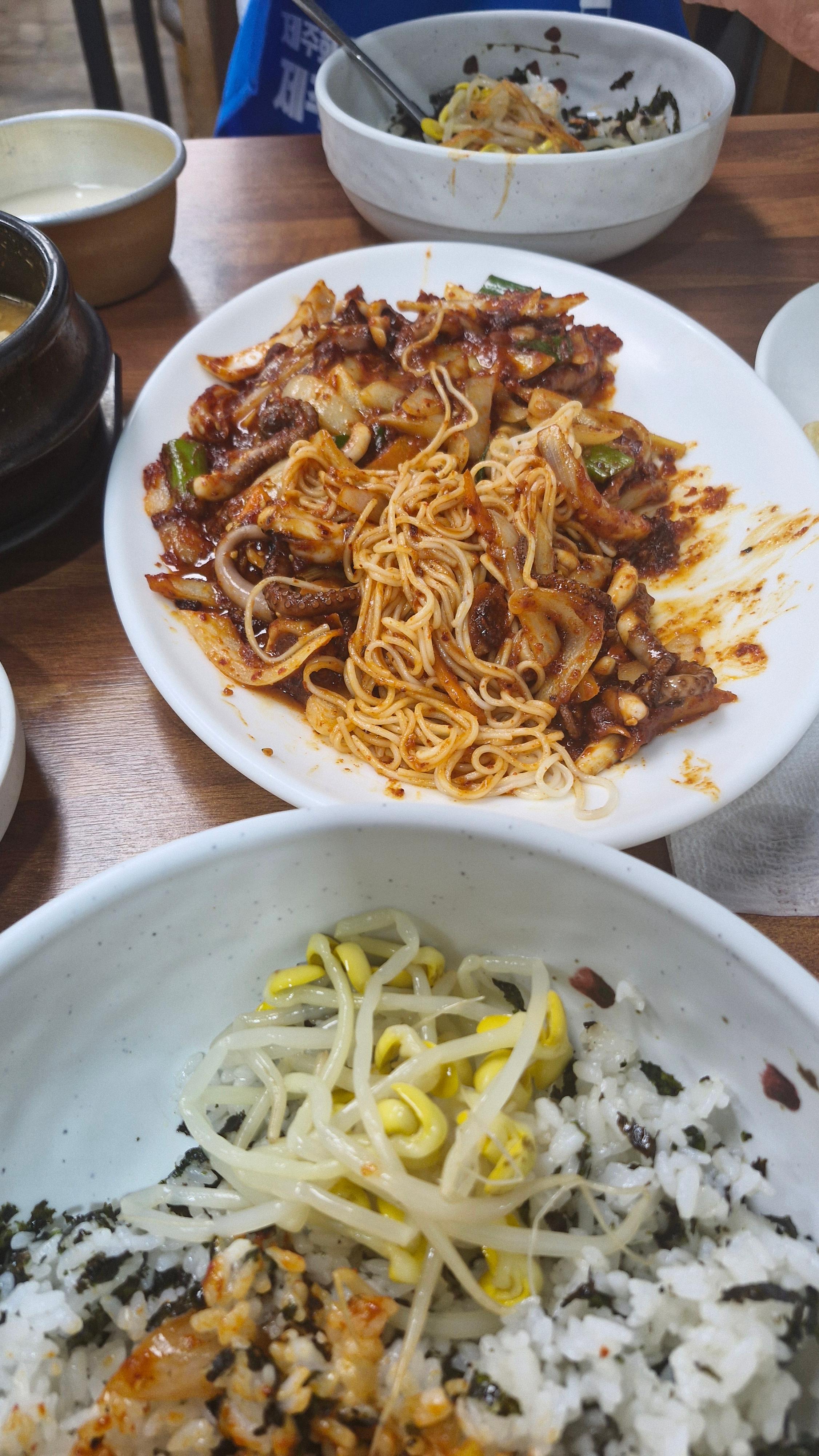 윤기 자르르 흐르는 낙지볶음 위에 콩나물이 푸짐하게 얹혀 있었고,