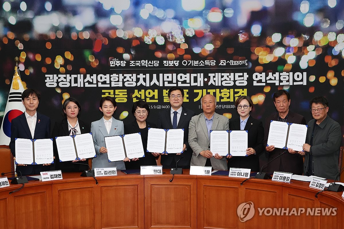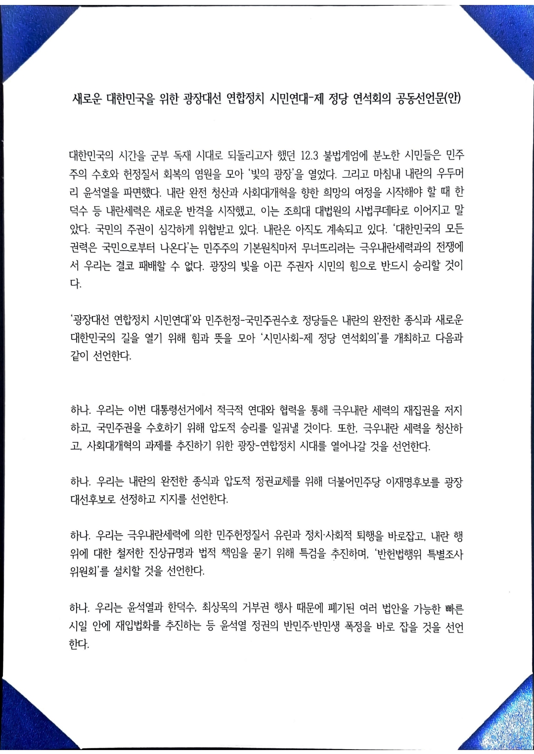 #광장대선 #공동선언문 #이재명 #후보단일화 #사회대개혁위원회 #정치개혁 #결선투표제 #국민참여형개헌 #진보결집 #보수분열