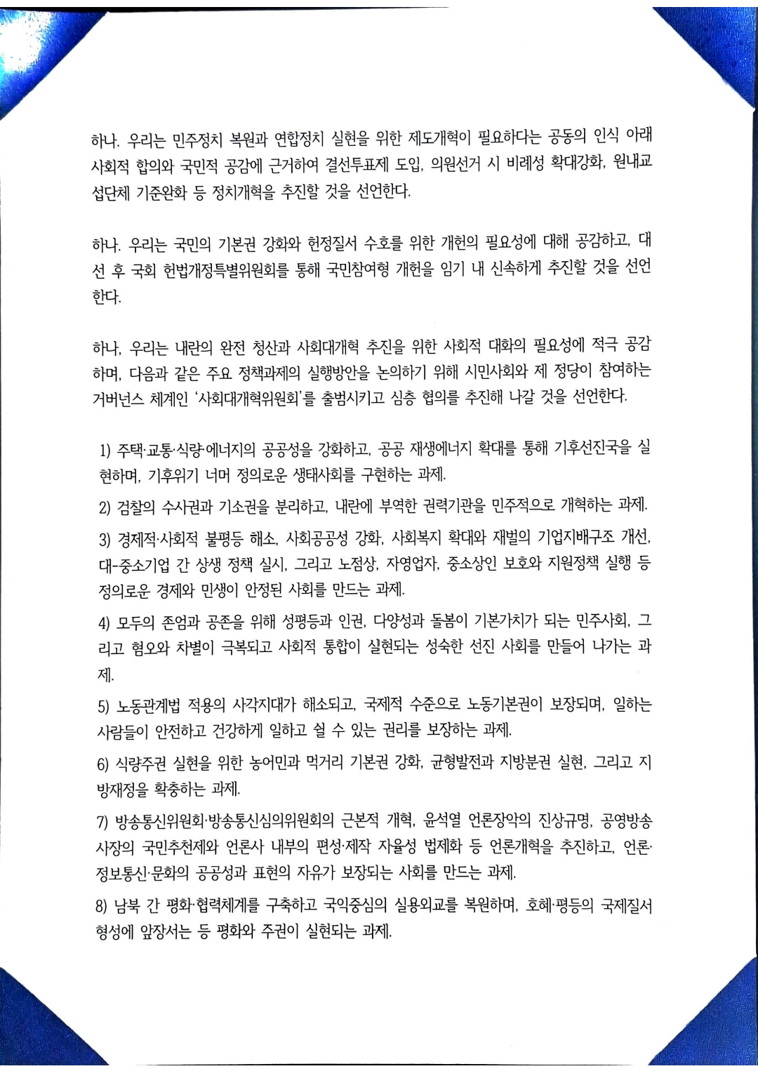 이러한 배경 속에서 공동선언문은 진보 진영의 대선 후보 단일화, 내란 세력 청산을 위한 특별법 제정, 결선투표제 도입 등 정치제도 개혁, 그리고 사회 전반의 개혁 과제를 망라한 포괄적인 내용을 담고 있습니다.