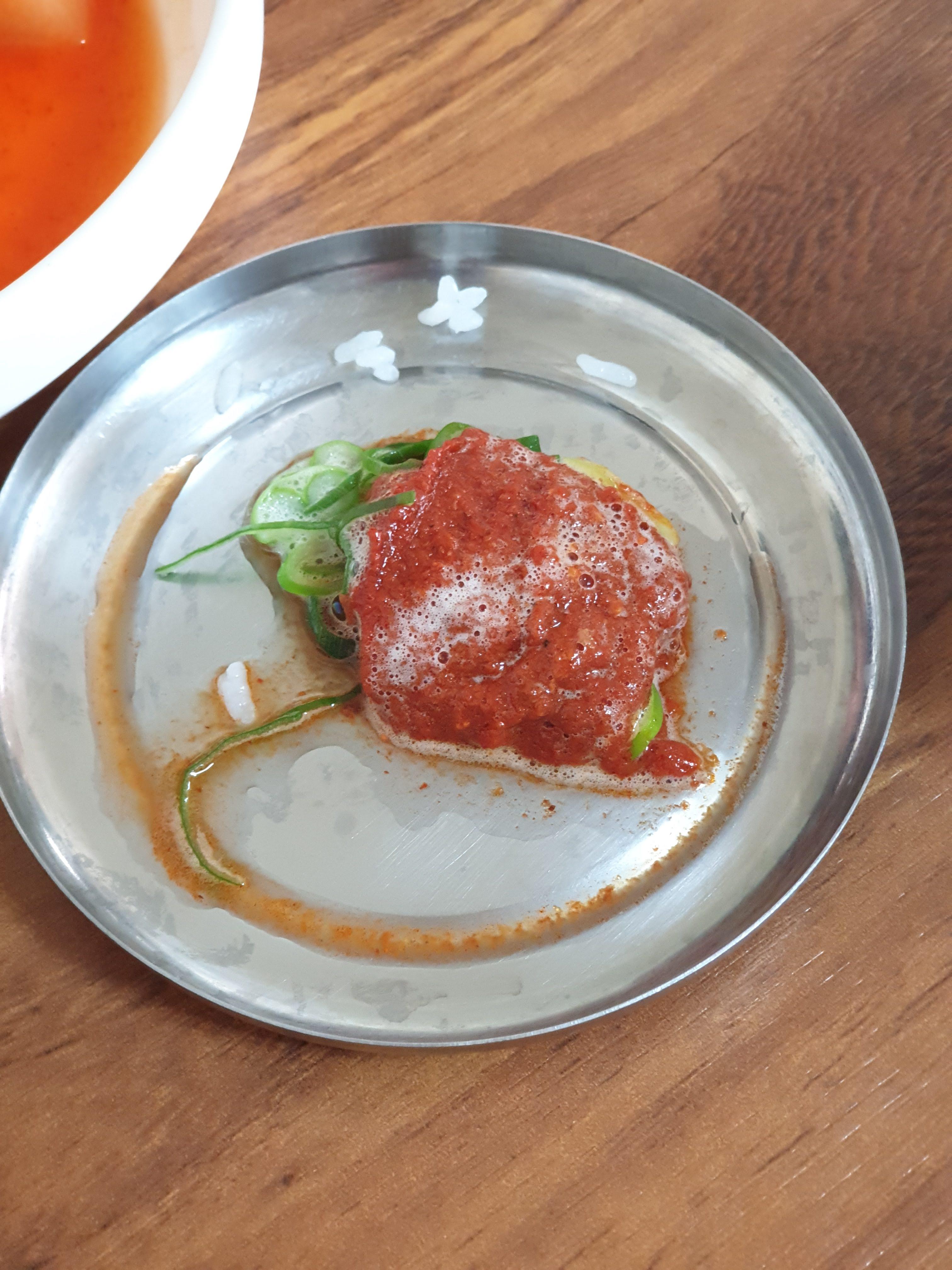 반쯤 먹은 뒤 조심스럽게 다데기를 풀어냈습니다.
