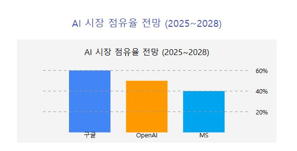 AI 시장 점유율 전망 (2025~2028) 구글 OpenAI MS 60% 40% 20%
