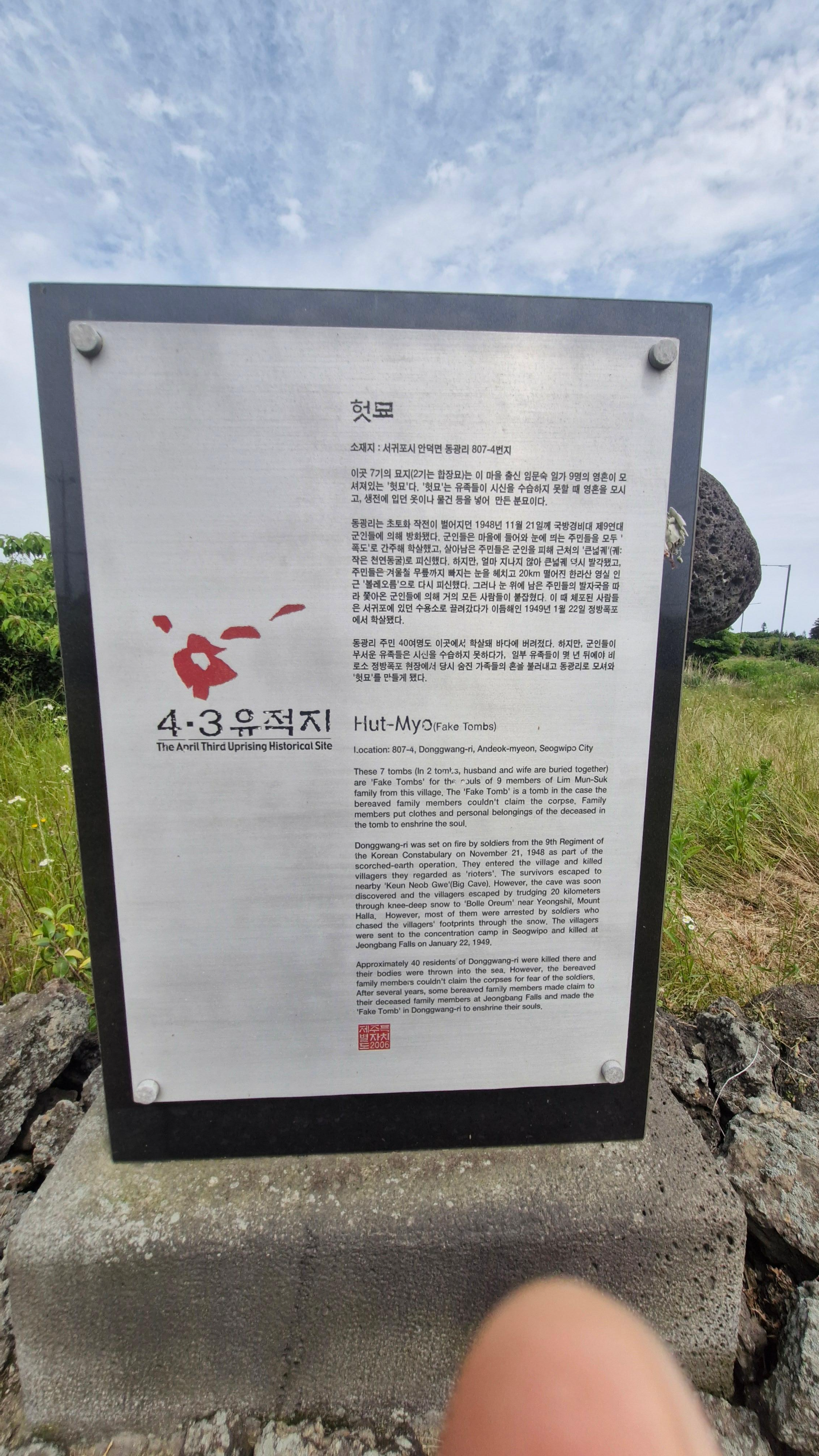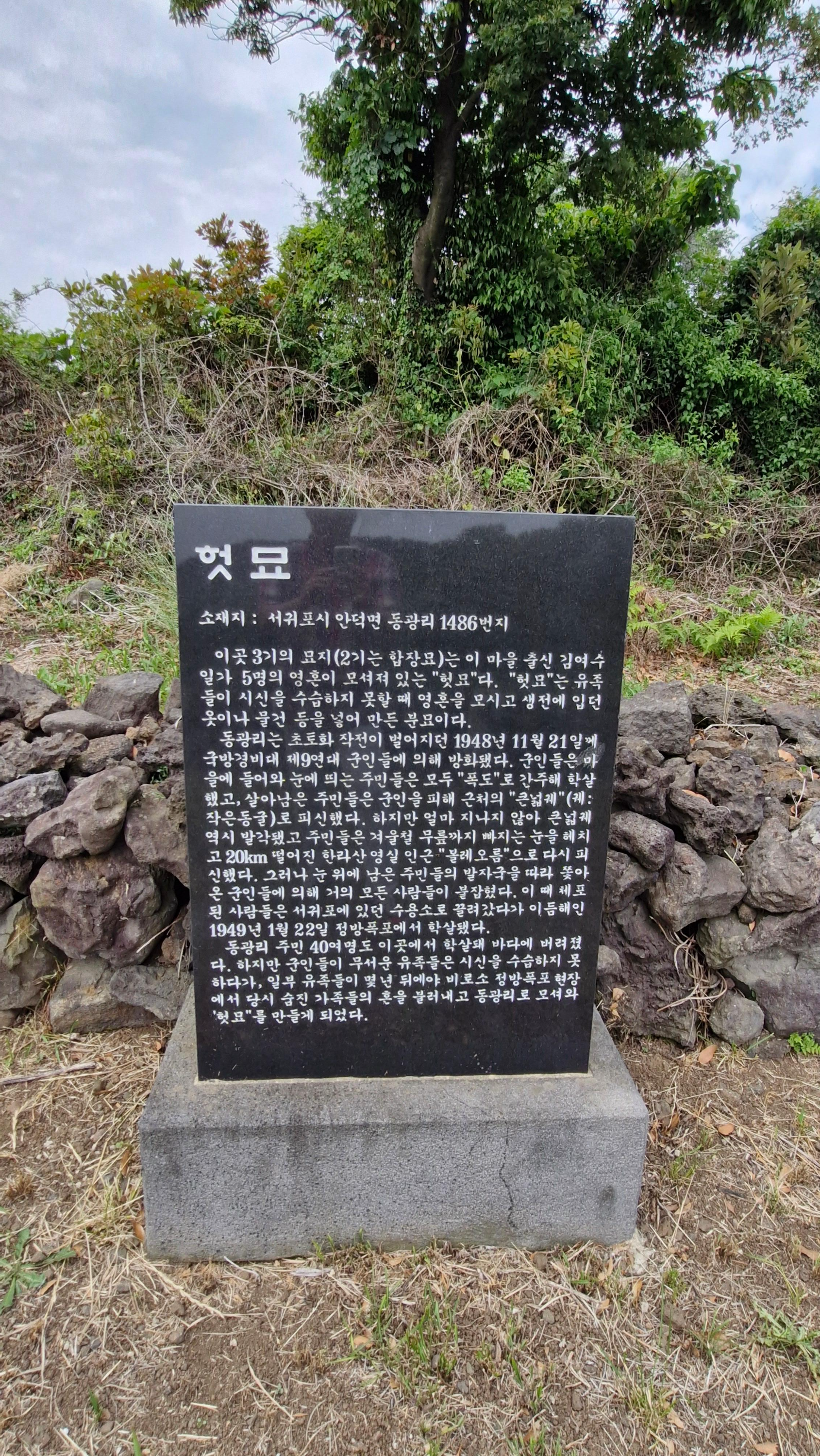 큰넓궤에 숨어 지내다 피신한 뒤 학살당한 김여수 씨 일가 5명의 영혼을 모신 무덤입니다. 김여수 씨 가족 역시 시신을 찾지 못하자, 살아남은 친척들이 그의 생전 옷가지 등을 넣어 봉분을 만들고 비석을 세웠습니다. 돈이 없던 집은 비석만 세워 놓고 명복을 빌었고, 좀 형편이 나은 집은 무당을 불러 망혼을 불러오는 의식을 치른 뒤 봉분을 만들어 제를 올렸습니다. 제주에서는 이러한 무덤을 헛묘라 불렀습니다. 말 그대로 시신 없는 무덤입니다.