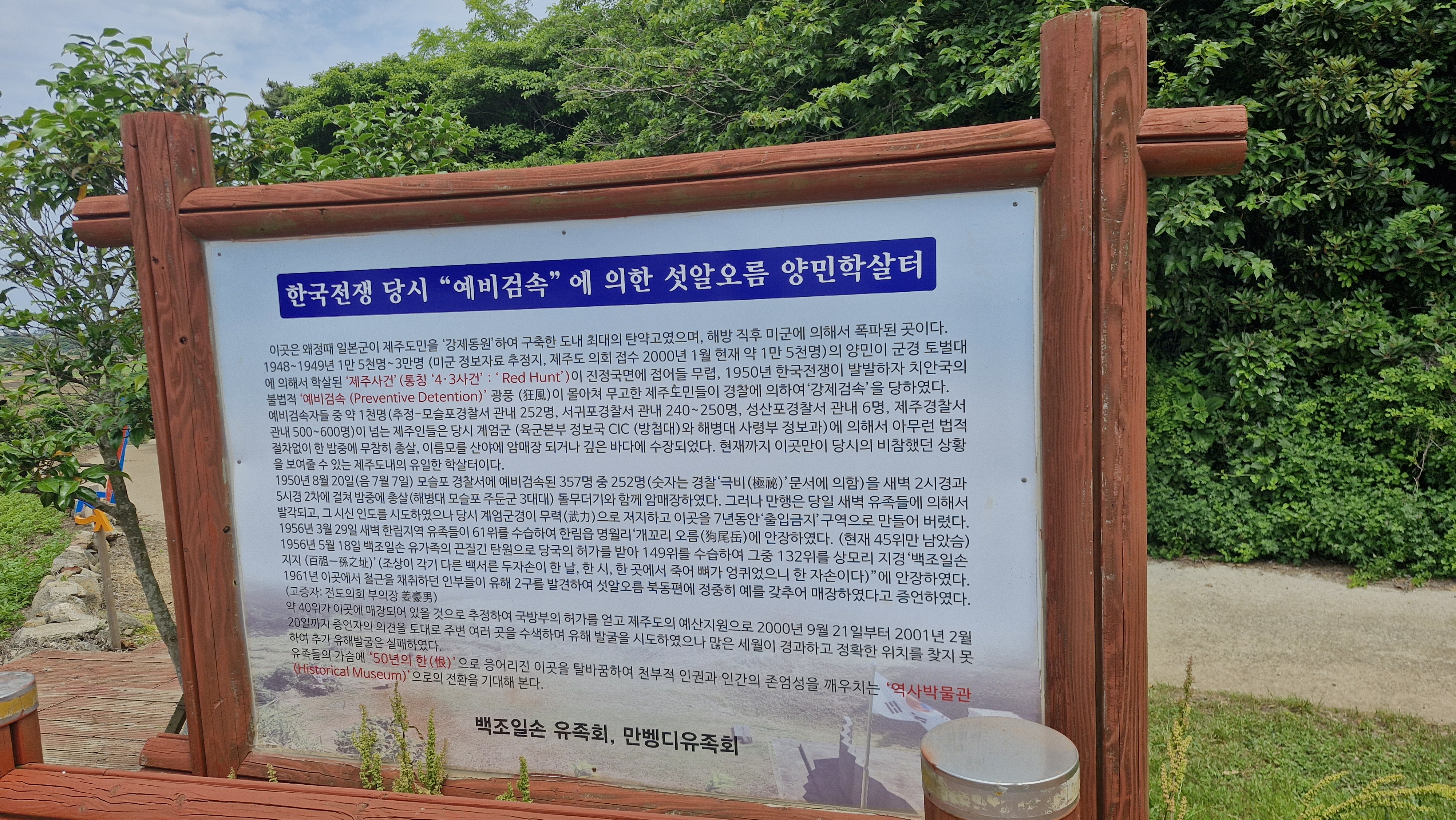 대정읍 섯알오름은 겉보기엔 평범한 오름처럼 보입니다. 그러나 그 자락에는 일본군이 남긴 콘크리트 탄약고 터가 있고, 그 앞에 4·3의 또 다른 비극을 알리는 안내판이 세워져 있습니다. 이곳은 한국전쟁 발발 직후 제주도에서 자행된 예비검속 학살의 대표적 현장입니다. 예비검속이란 전시 상황에 대비해 평소 요시찰 인물이나 전과자, 좌익으로 지목된 인물들을 미리 검거해 두는 조치를 말합니다. 1950년 6월 25일 전쟁이 발발하자, 이승만 정부와 군 당국은 전국적으로 예비검속을 실시했고, 제주도에서도 4·3 당시 ‘좌익’으로 분류되었던 주민들이 대거 체포되었습니다. 문제는 이렇게 잡아 가둔 주민들을 적법한 절차 없이 집단 처형했다는 점입니다.