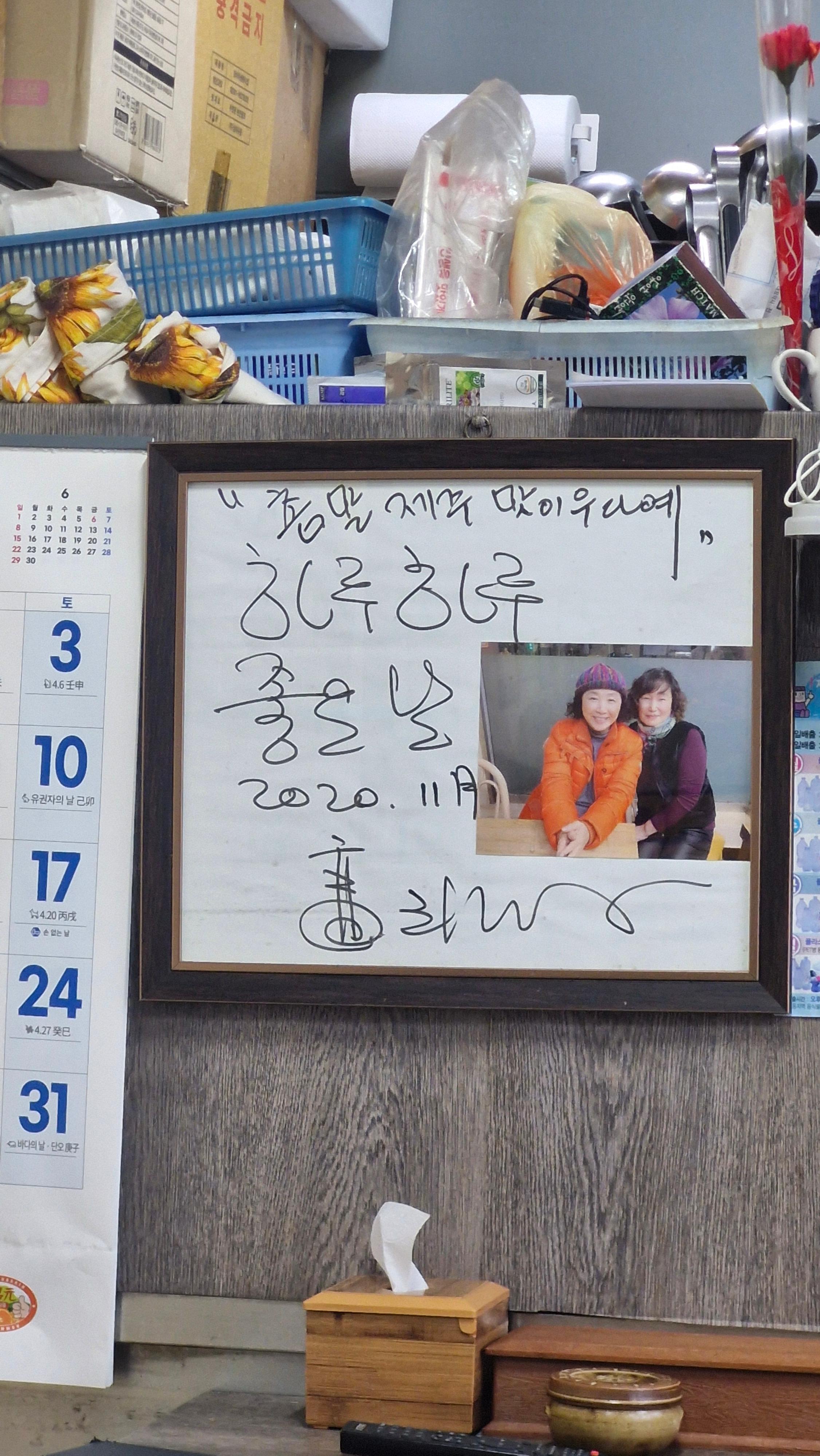 처음 이 식당을 들어서면 가장 먼저 시선을 사로잡는 것은 벽에 걸린 고두심 씨의 싸인 사진이다.