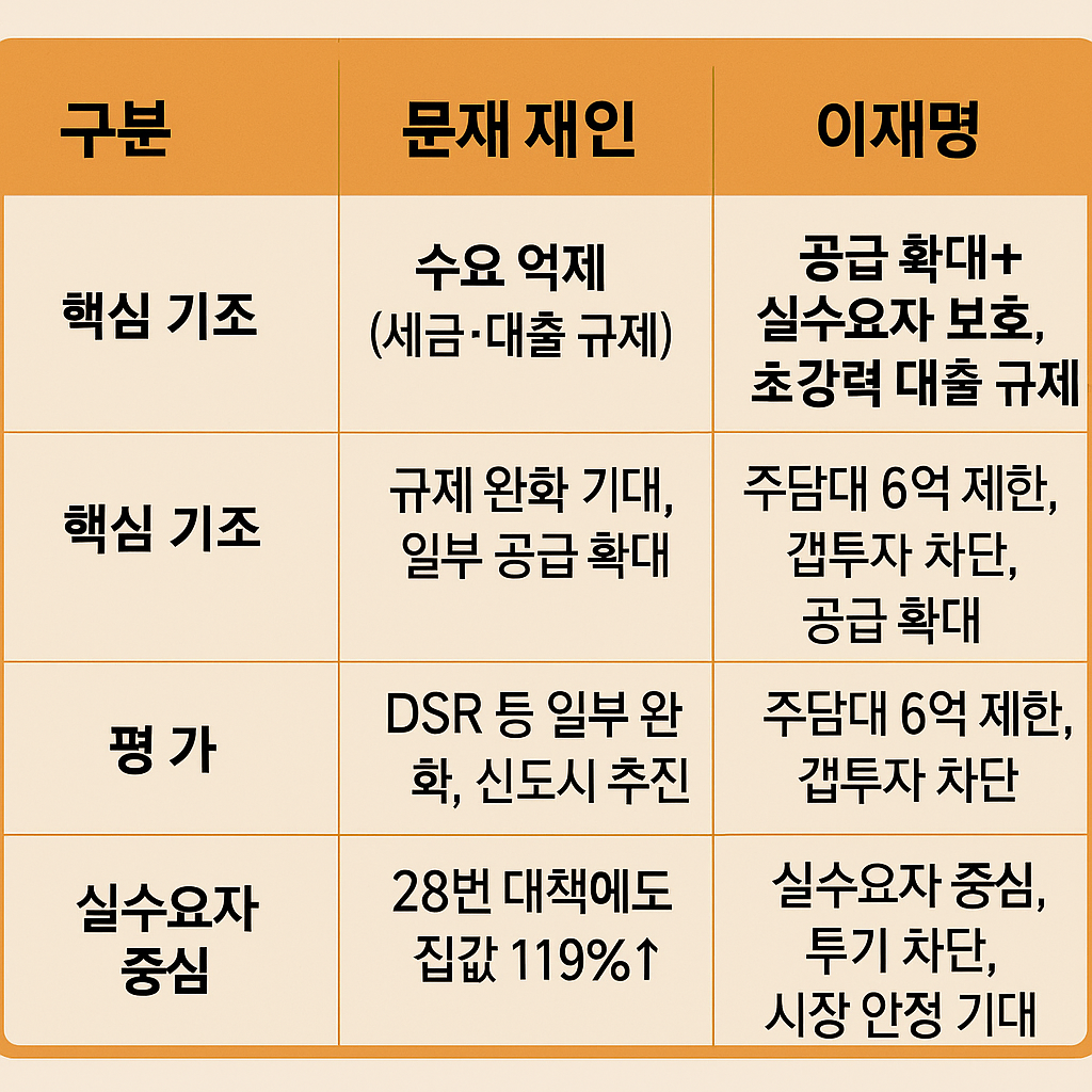 문재인·윤석열 정부 모두 규제→완화의 사이클을 돌았습니다. 그러나 이재명 정부는 "세금만으로는 집값 못 잡는다"라며 직접 대출을 조이는 강수로 나섰습니다.