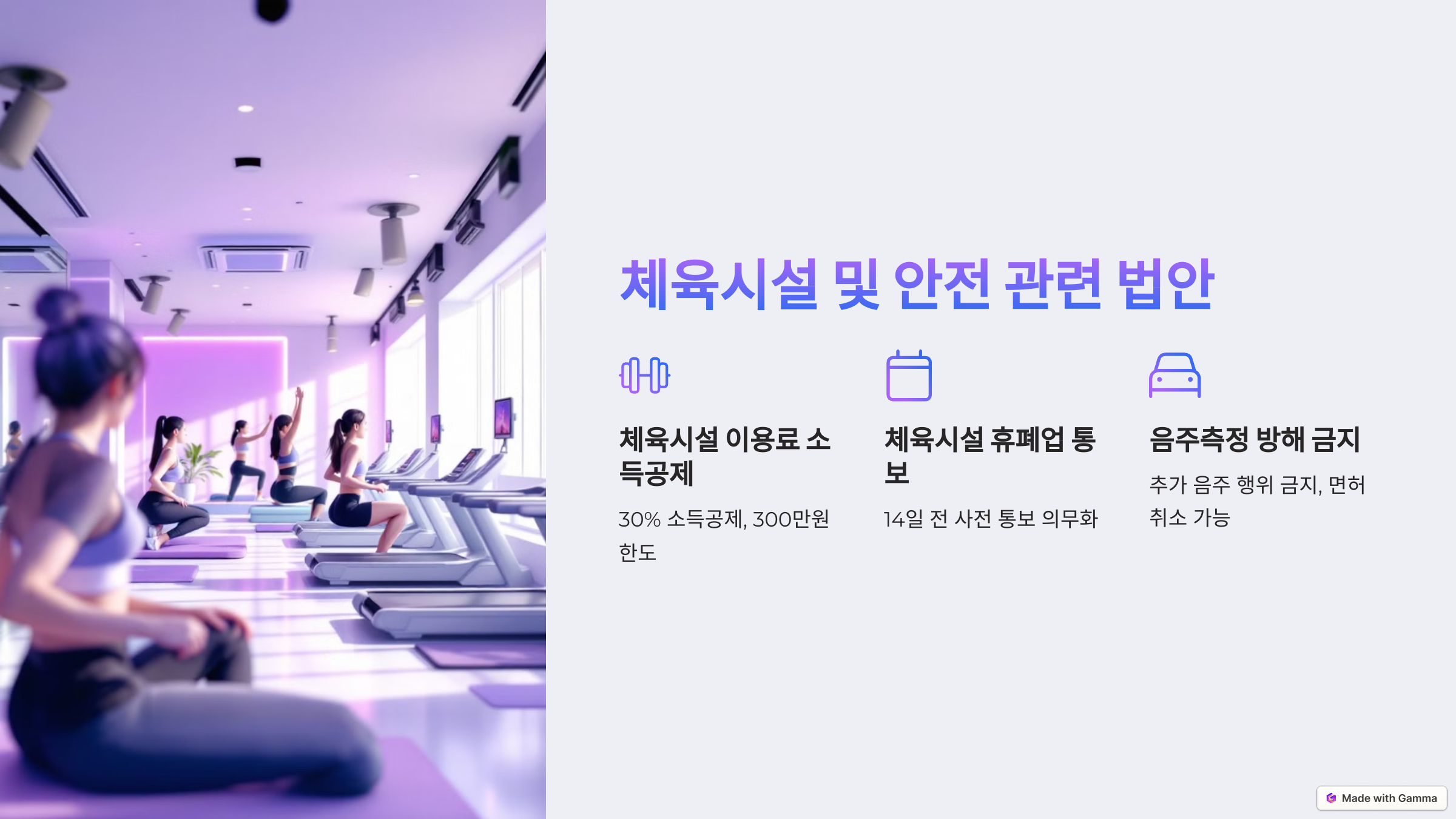 | 2025년 4월 23일 | 체육시설 휴업·폐업 사전 통보 의무: 헬스장 및 기타 체육시설은 14일 전에 회원과 일반 이용자에게 휴업 또는 폐업 사실을 알려야 하며, 이를 위반할 경우 최대 100만원의 과태료가 부과됩니다. 이는 회원들에게 사전 통지를 통해 피해를 방지하기 위한 조치입니다. 🏋️♂️🏊♀️ |