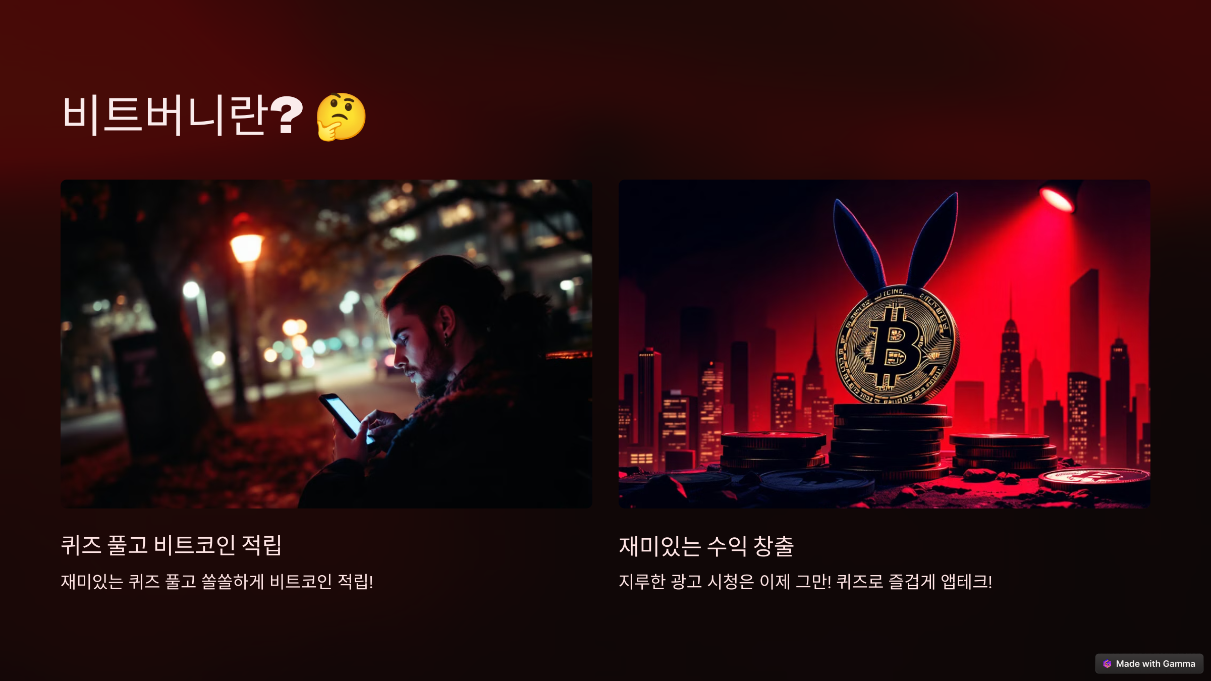 비트버니(Bitbunny)는 퀴즈를 풀고 비트코인을 적립할 수 있는 흥미로운 앱테크 플랫폼이에요! 사용자는 다양한 주제의 퀴즈에 참여하여 정답을 맞히면 보상을 받을 수 있죠. 광고 보기, 게임 플레이 같은 기존의 앱테크 방식보다 훨씬 재미있게 수익을 올릴 수 있다는 점이 큰 장점이에요.
