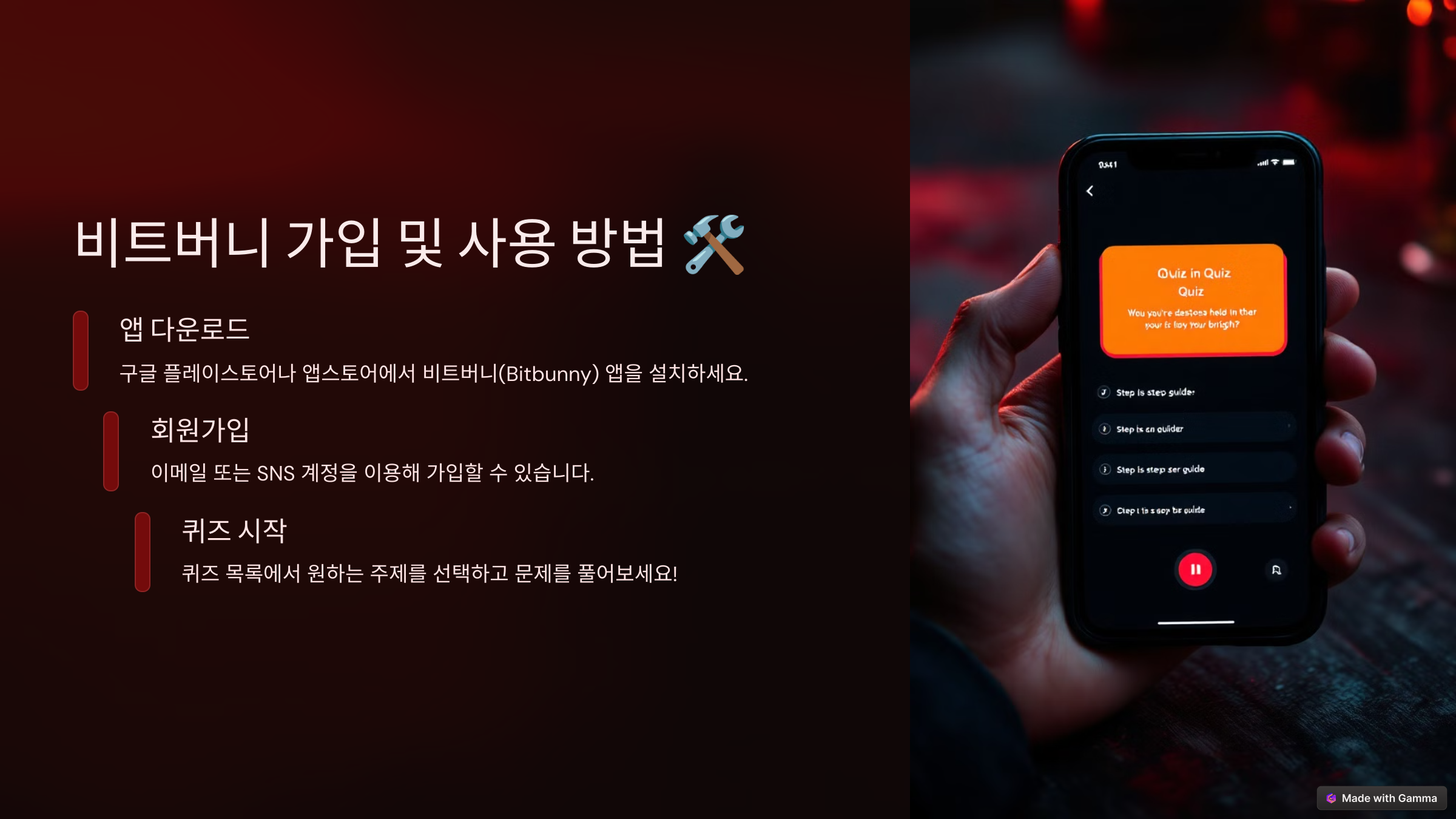 | 1️⃣ 앱 다운로드 | 구글 플레이스토어나 앱스토어에서 비트버니(Bitbunny) 앱을 설치하세요. |