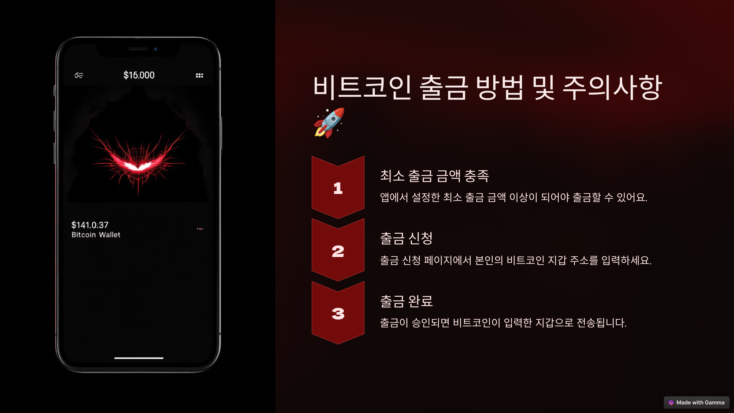 | 2️⃣ 출금 신청 | 출금 신청 페이지에서 본인의 비트코인 지갑 주소를 입력하세요. |
