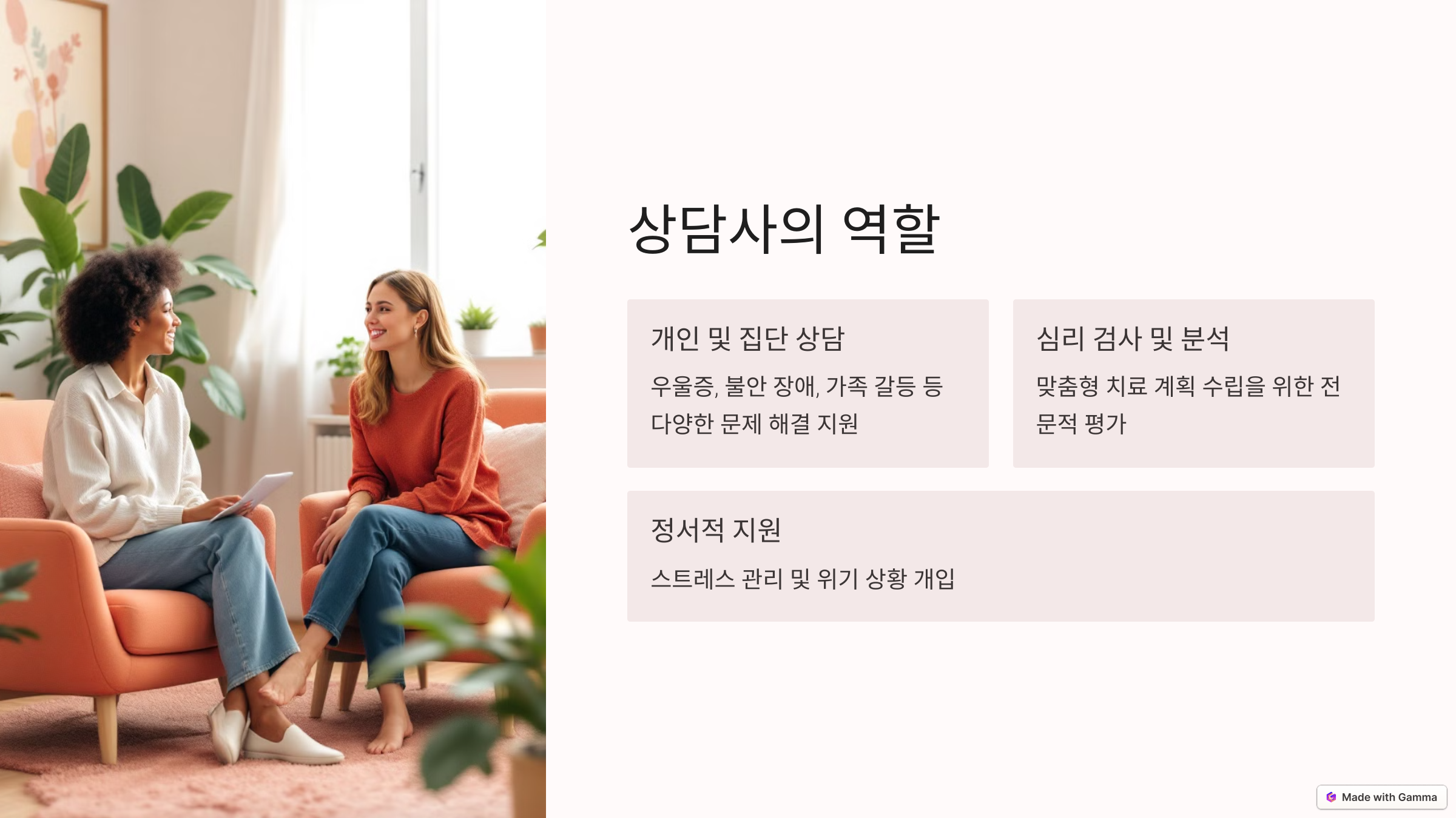 상담사는 다양한 이유로 심리적 어려움을 겪는 사람들을 돕는 전문가입니다. 개인적인 고민부터 가족 문제, 직장 스트레스, 정신 건강 문제까지 정서적 안정을 찾을 수 있도록 상담을 진행합니다.