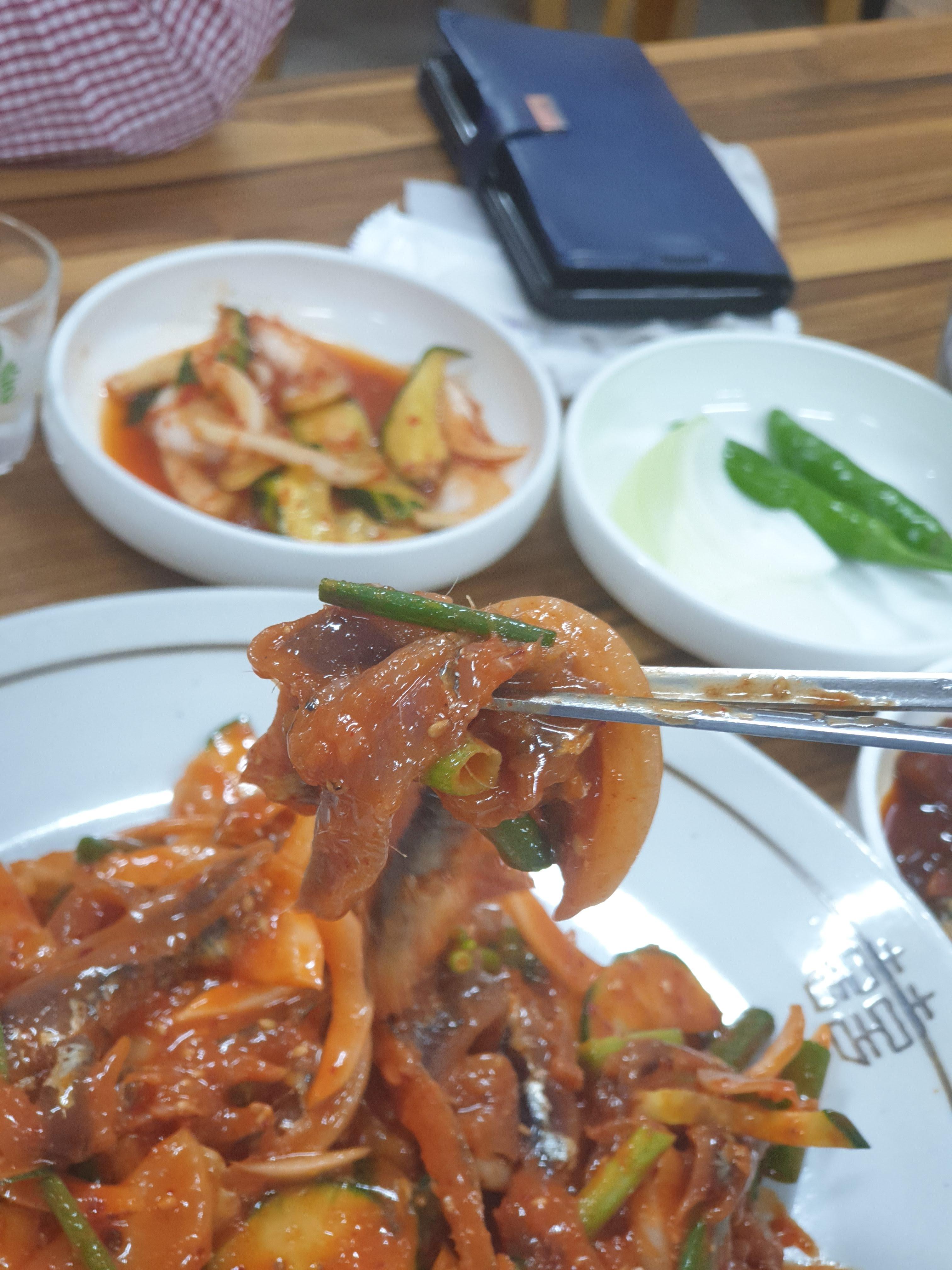 ✔ 멜 초무침 – 아삭한 채소와 새콤한 양념이 멜(큰 멸치)과 어우러져 한입 넣는 순간 입맛이 확 살아난다.