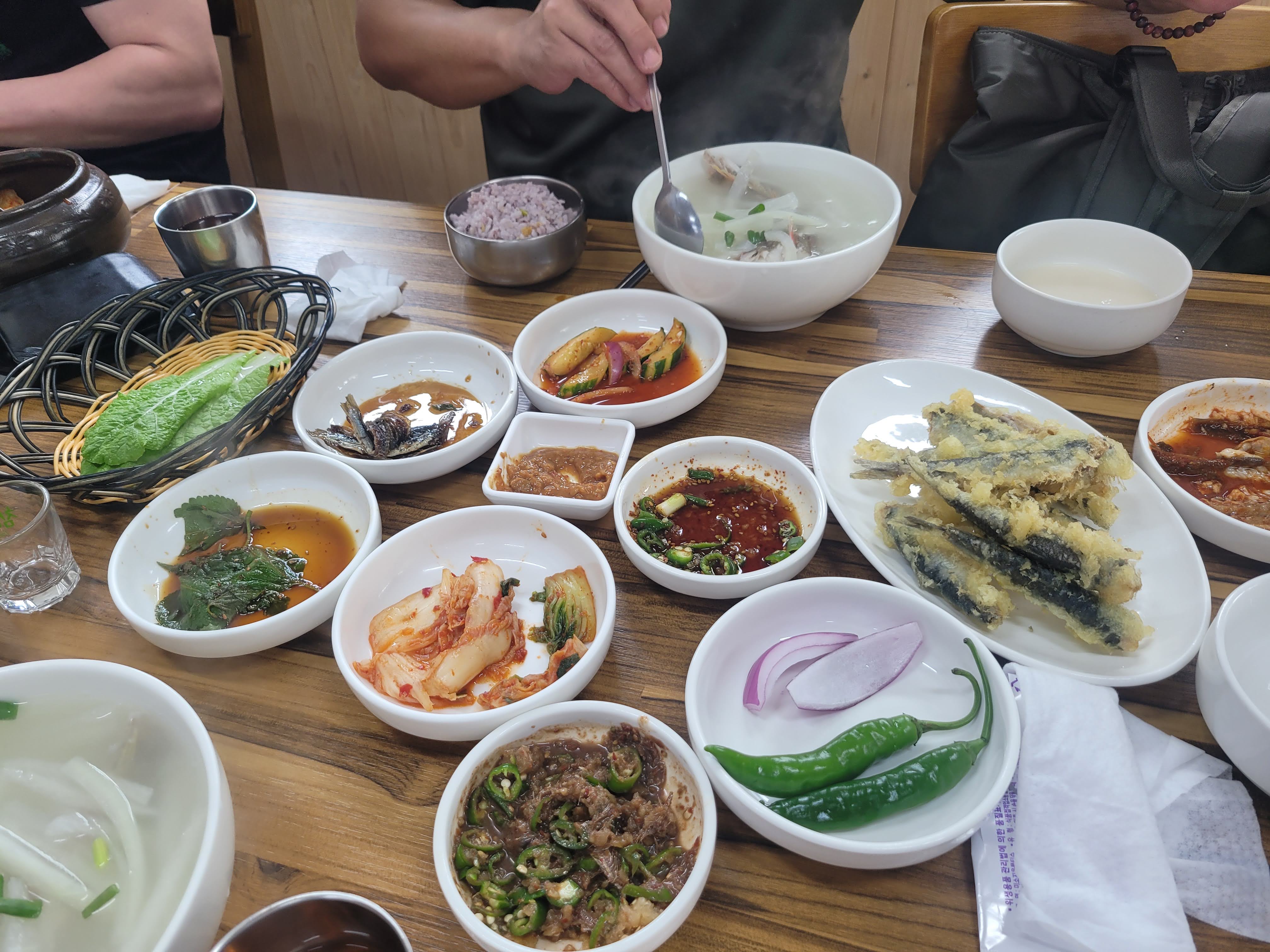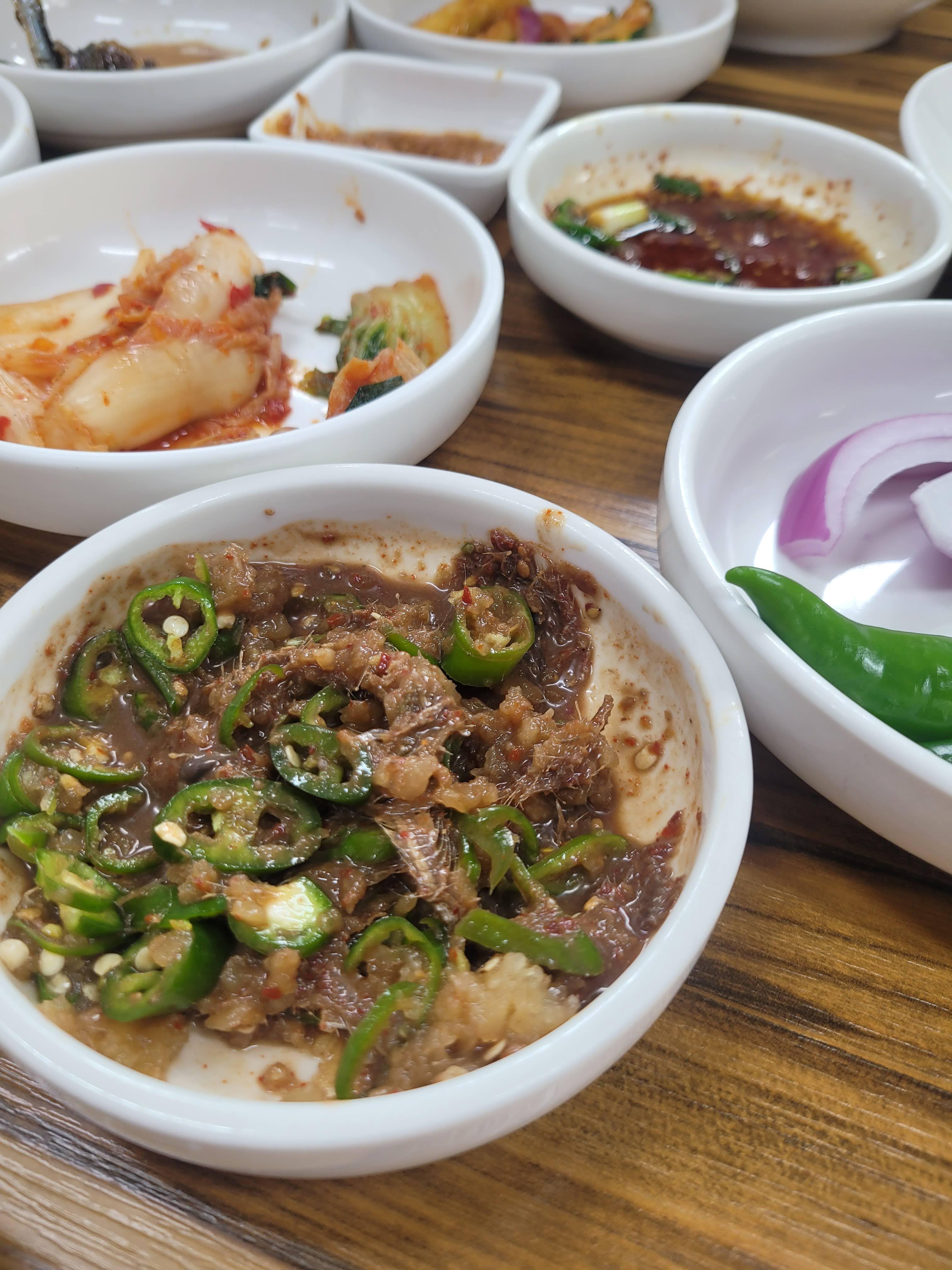 ✔ 젓갈과 기본 반찬들 – 칼칼한 고추가 송송 썰어진 젓갈을 한 점 떠서 밥 위에 올려 한입, 감칠맛이 폭발한다.