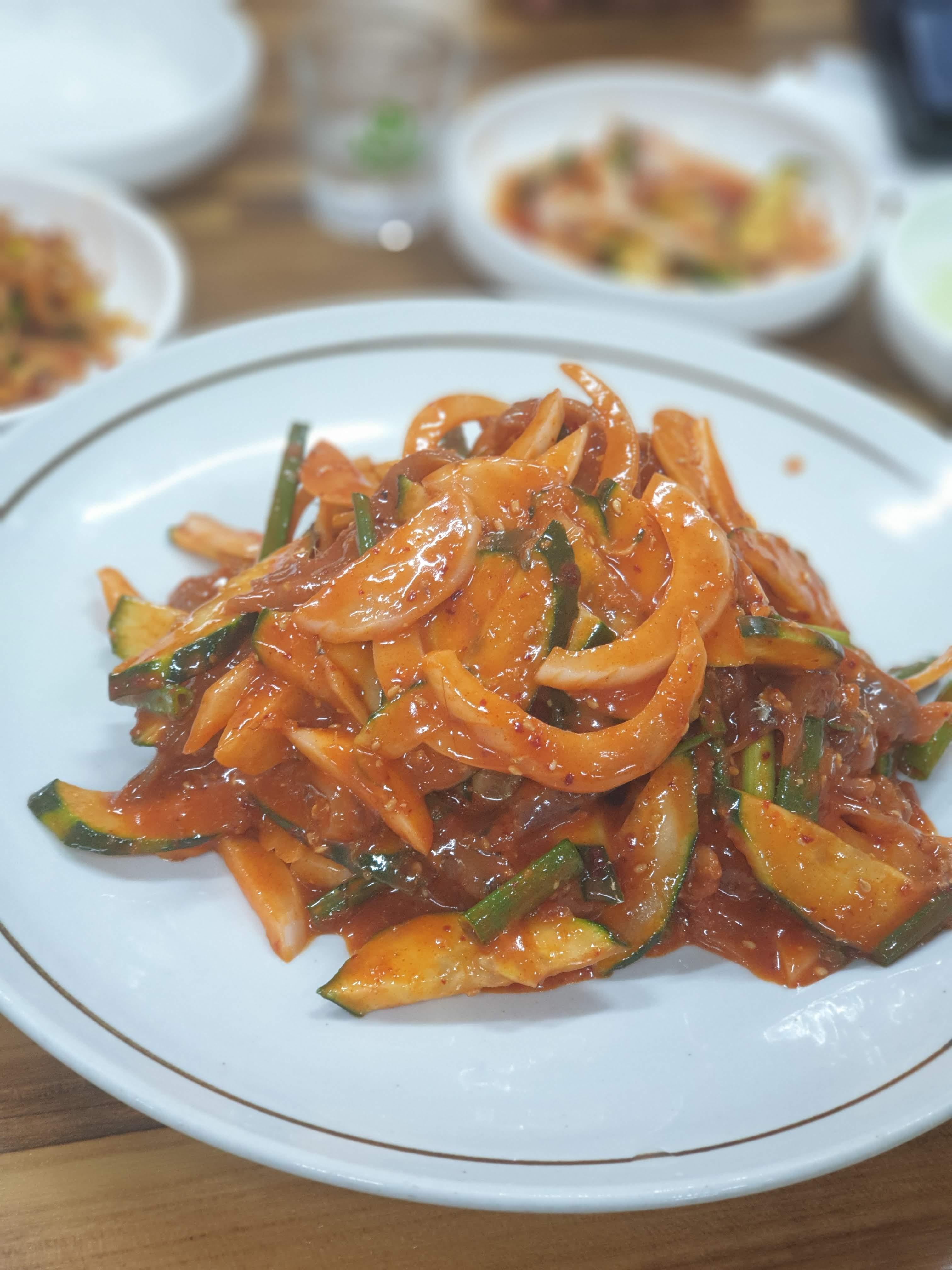 ✔ 멜 초무침 – 아삭한 채소와 새콤한 양념이 멜(큰 멸치)과 어우러져 한입 넣는 순간 입맛이 확 살아난다.