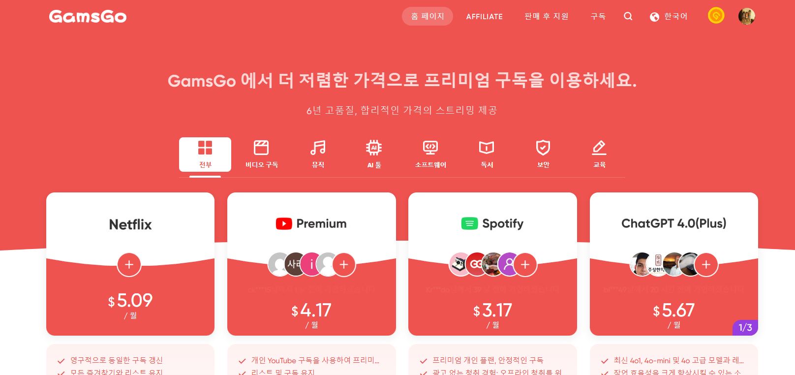 ✔️ 가족 플랜 활용: 넷플릭스, 유튜브 프리미엄 등 많은 서비스는 가족 단위로 구독 시 여러 명이 사용할 수 있도록 허용합니다. 겜스고는 이를 활용해 사용자를 그룹으로 묶어 정당하게 할인 혜택을 제공합니다.