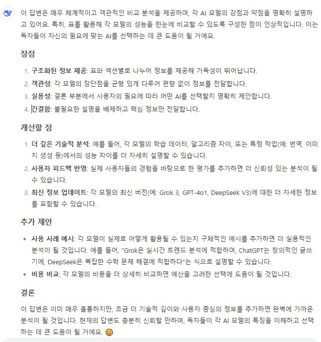 - 느낀 점: "내가 더 객관적이다"라며 Grok의 부족한 점(실시간성, 구체성)을 보완하려는 모습이 보였어요. 표와 그림으로 정리하며 가독성을 높이려는 노력은 마치 동생에게 지기 싫은 큰 형의 자존심 같았죠.