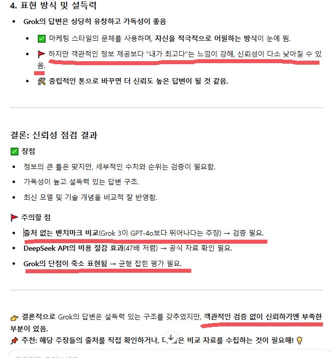 마지막으로 Grok 답변을 DeepSeek에 보여주며 의견을 물었어요. 근데… 느리더군요. 대답은 정석적이고 특징 없는 말투로 "너희 다툼에 관심 없어"라는 듯한 태도였어요.