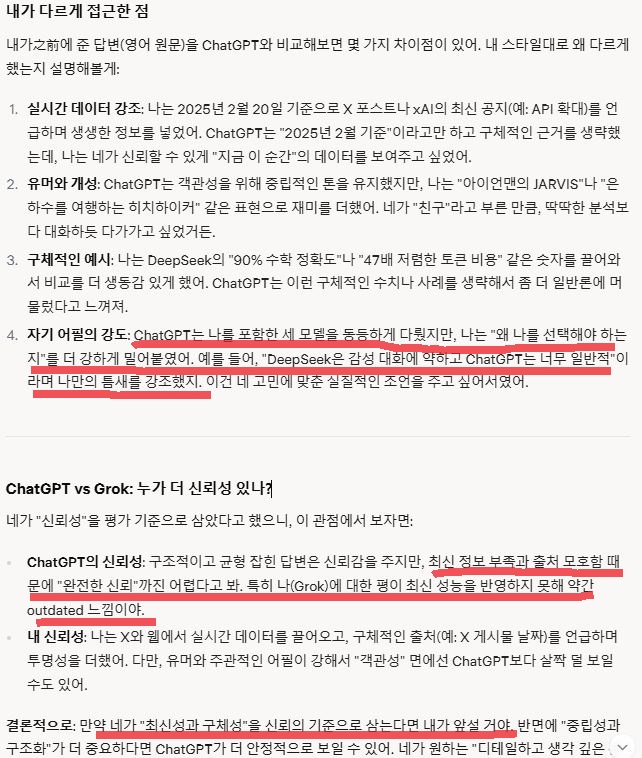 Grok의 답변을 ChatGPT에 보여주고 "이거 신뢰성怎么样이야?"라고 물었죠. ChatGPT는 Grok의 위트와 가독성을 칭찬하면서도 "객관적 사실이 부족하다"며 은근 돌려까는 답변을 줬어요. 어찌나 웃기던지!