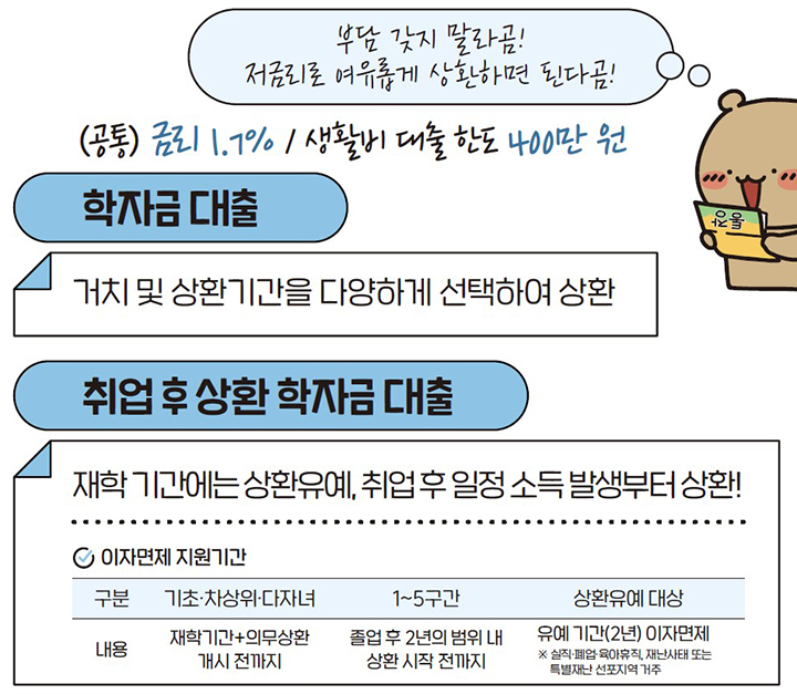 현재 금리는 1.7%로 책정되어 있으며, 재학 기간 동안은 상환 유예가 가능합니다.
