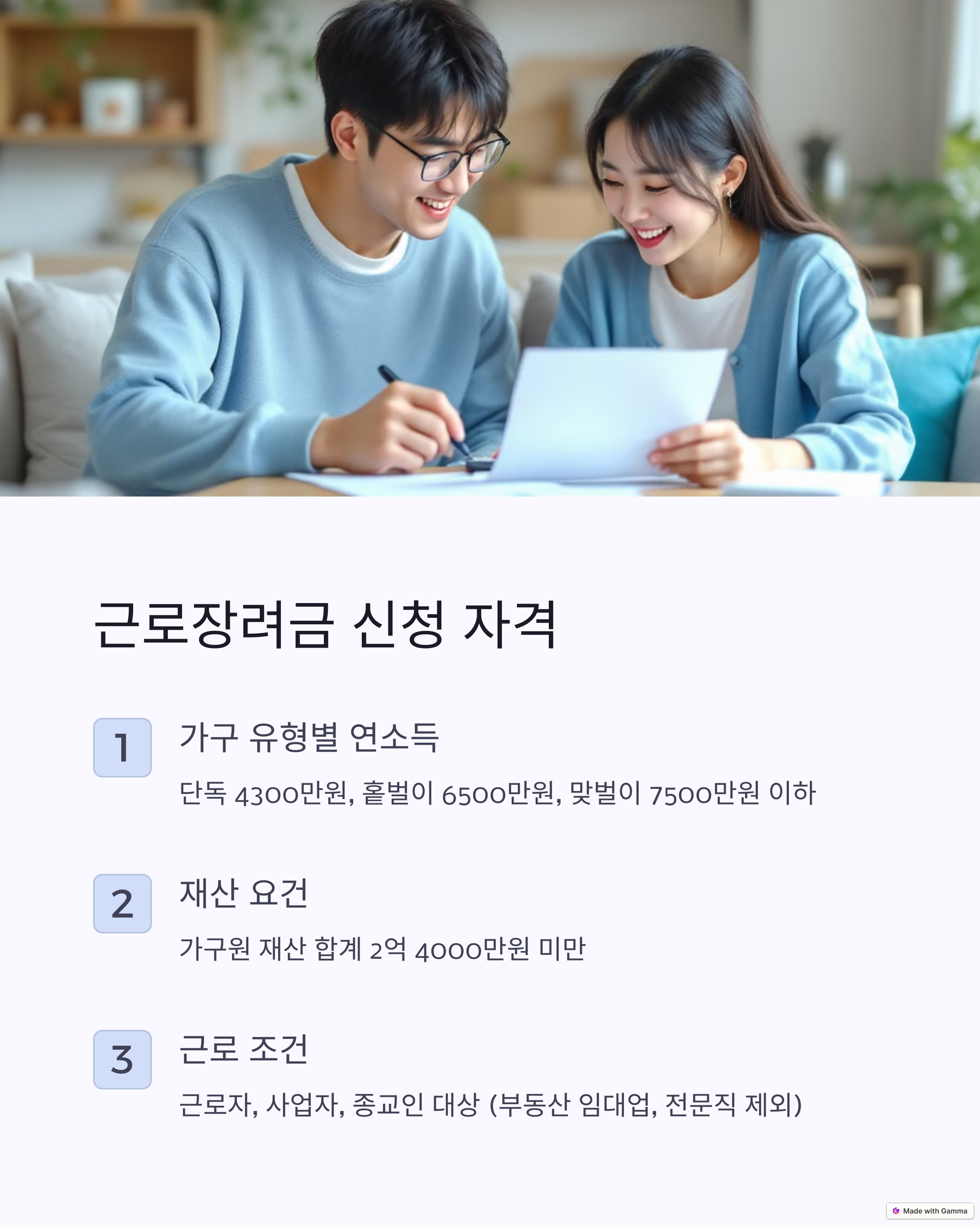근로장려금 신청 자격은 가구 유형과 연소득 기준에 따라 달라집니다.