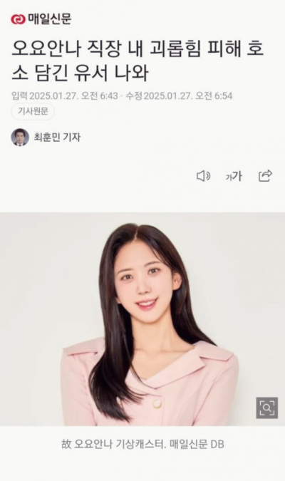 지난해 극단적인 선택으로 세상을 떠난 고 오요안나 기상캐스터의 유서가 발견되면서 우리 사회는 직장 내 괴롭힘 문제의 심각성을 다시금 인식하게 되었습니다.